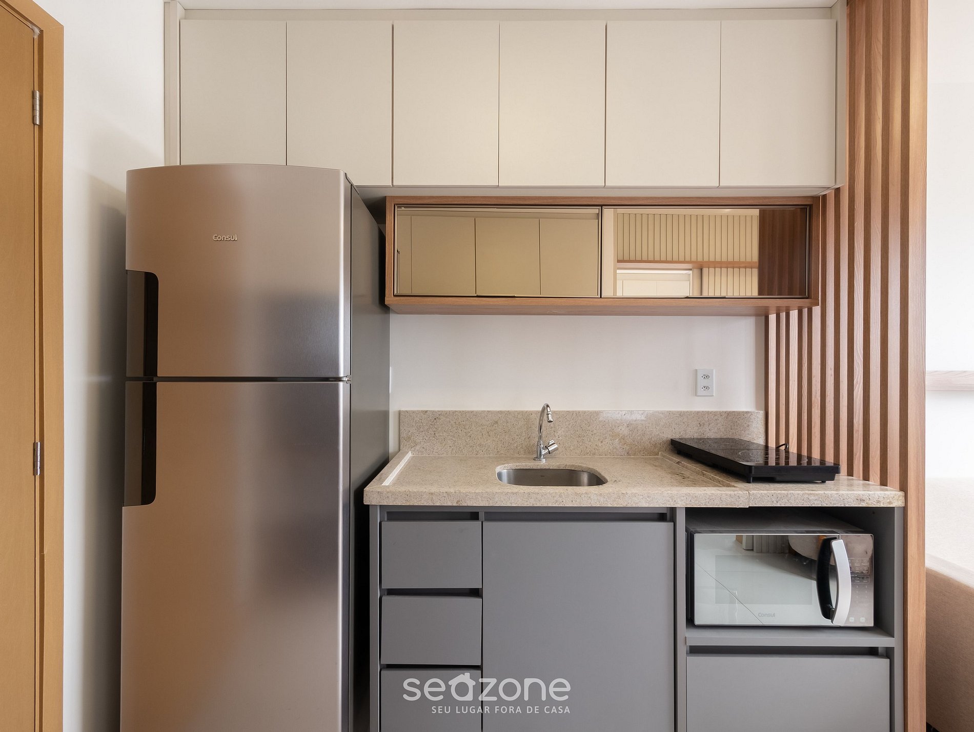 - Cozinha completa com geladeira, fogão cooktop elétrico, micro-ondas, sanduicheira, Airfryer, Kit café (suporte para filtro, garrafa térmica), liquidificador, taças de vinho, panelas, louças e utensílios;
