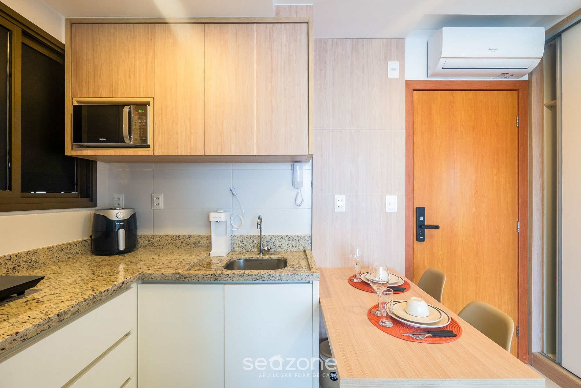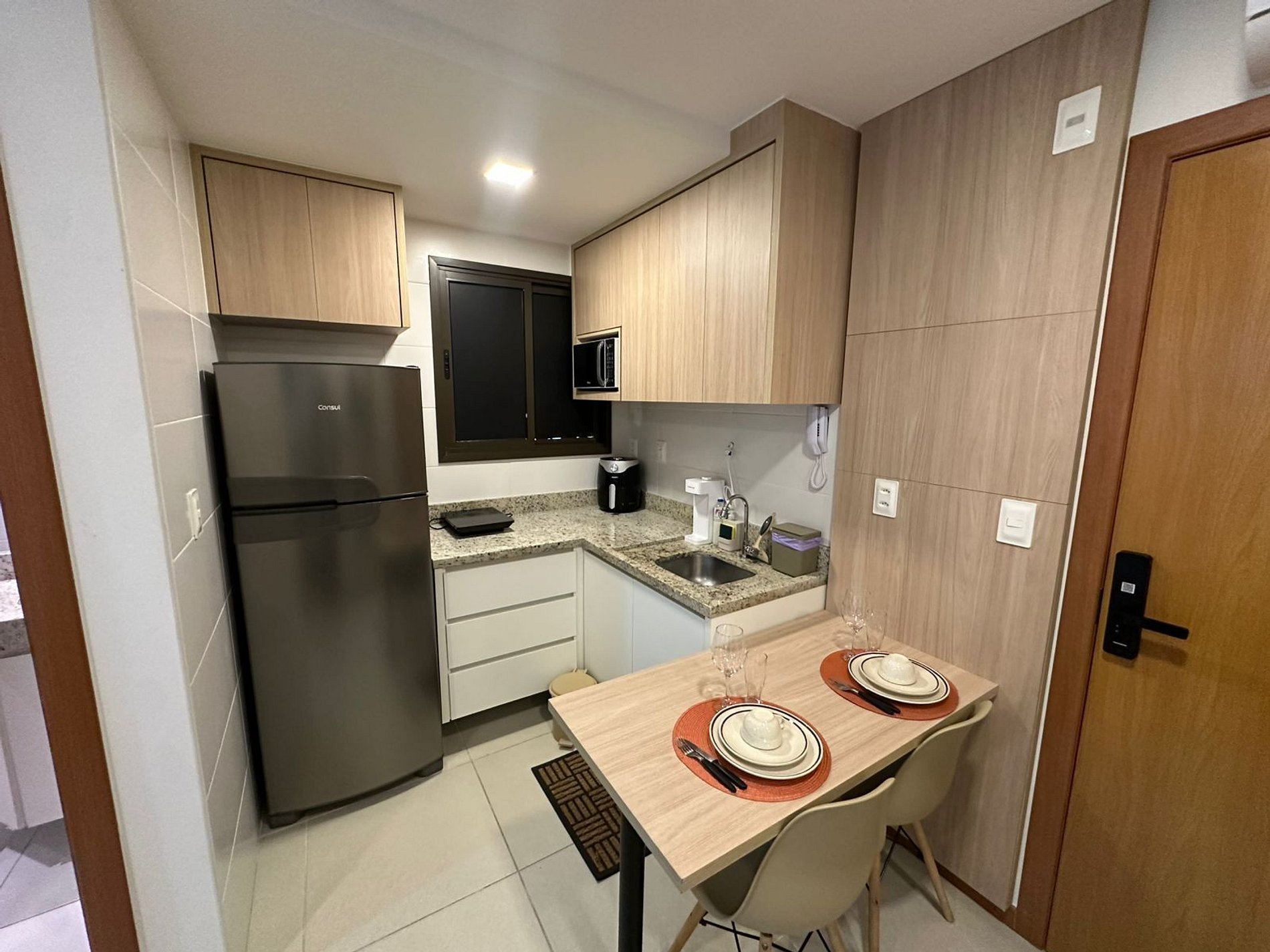 - Cozinha completa com geladeira, fogão cooktop de indução, micro-ondas, airfryer, sanduicheira, kit café (suporte e garrafa térmica), chaleira elétrica, liquidificador, taças de vinho, panelas, louças e utensílios;