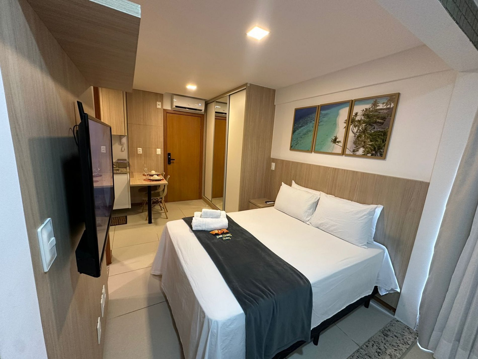 - Cama de casal, armário, smart TV e ar-condicionado Split;