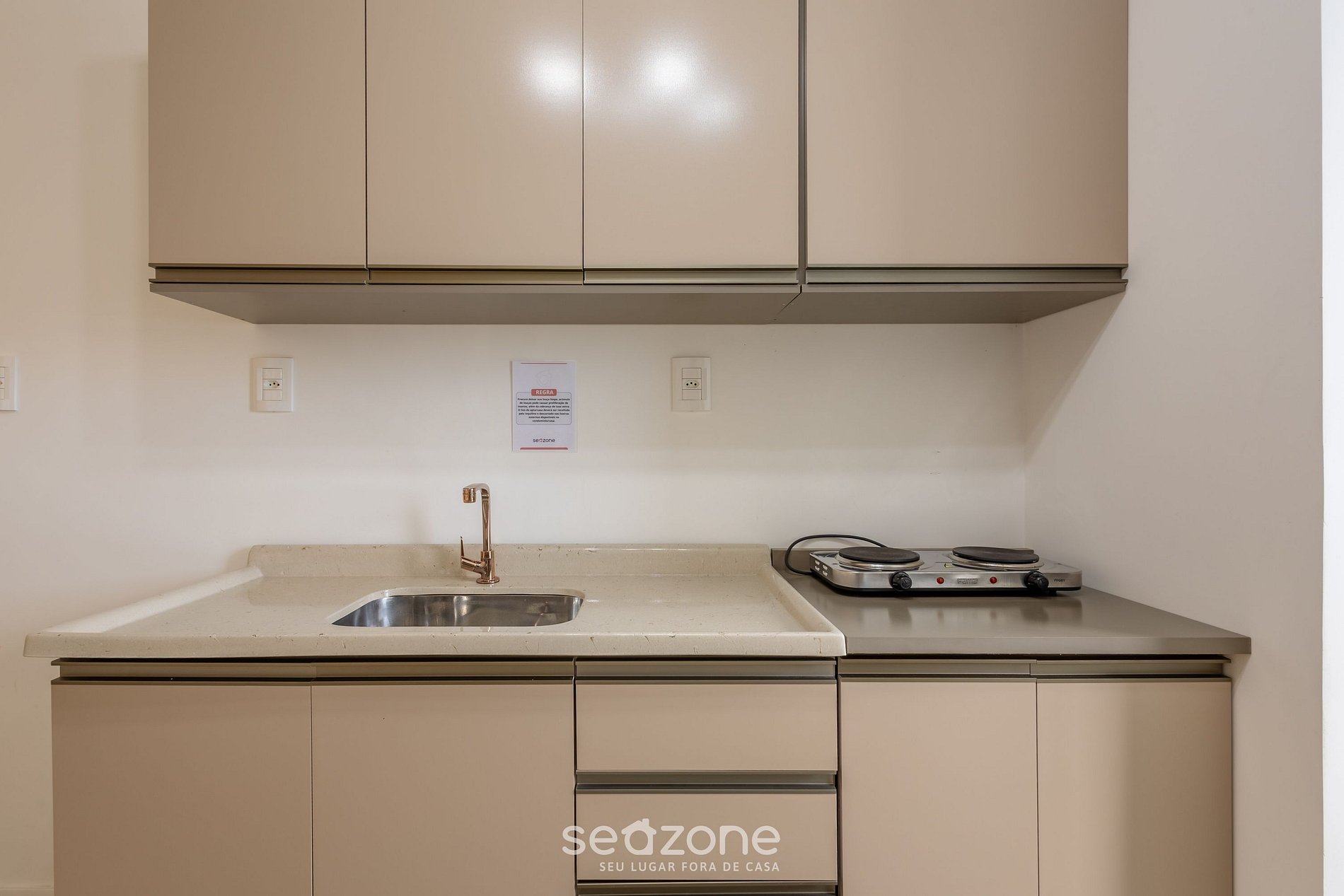 - Cozinha completa com geladeira, cooktop elétrico, micro-ondas, airfryer, sanduicheira, chaleira elétrica, liquidificador, Kit café (suporte para filtro, garrafa térmica) e utensílios;