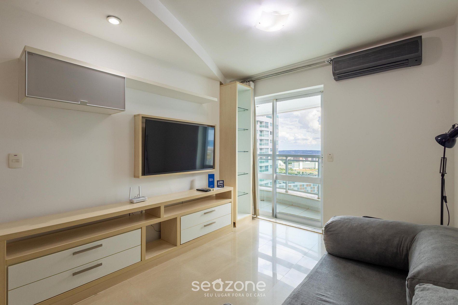 - Sala de estar com sofá, Smart TV e ar-condicionado;