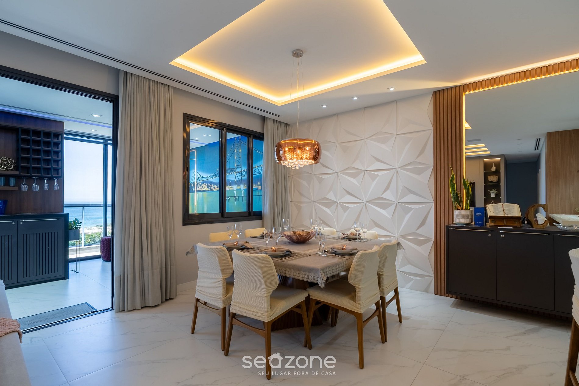 - Espaço para jantar com mesa e cadeiras, além de espaço de trabalho dedicado;