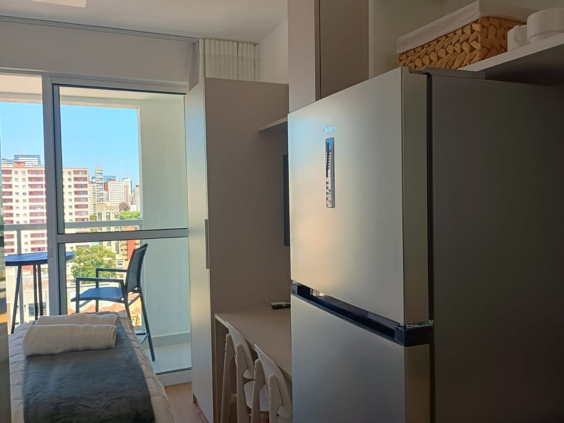 - Cama de casal, armário, Smart TV e ar-condicionado;