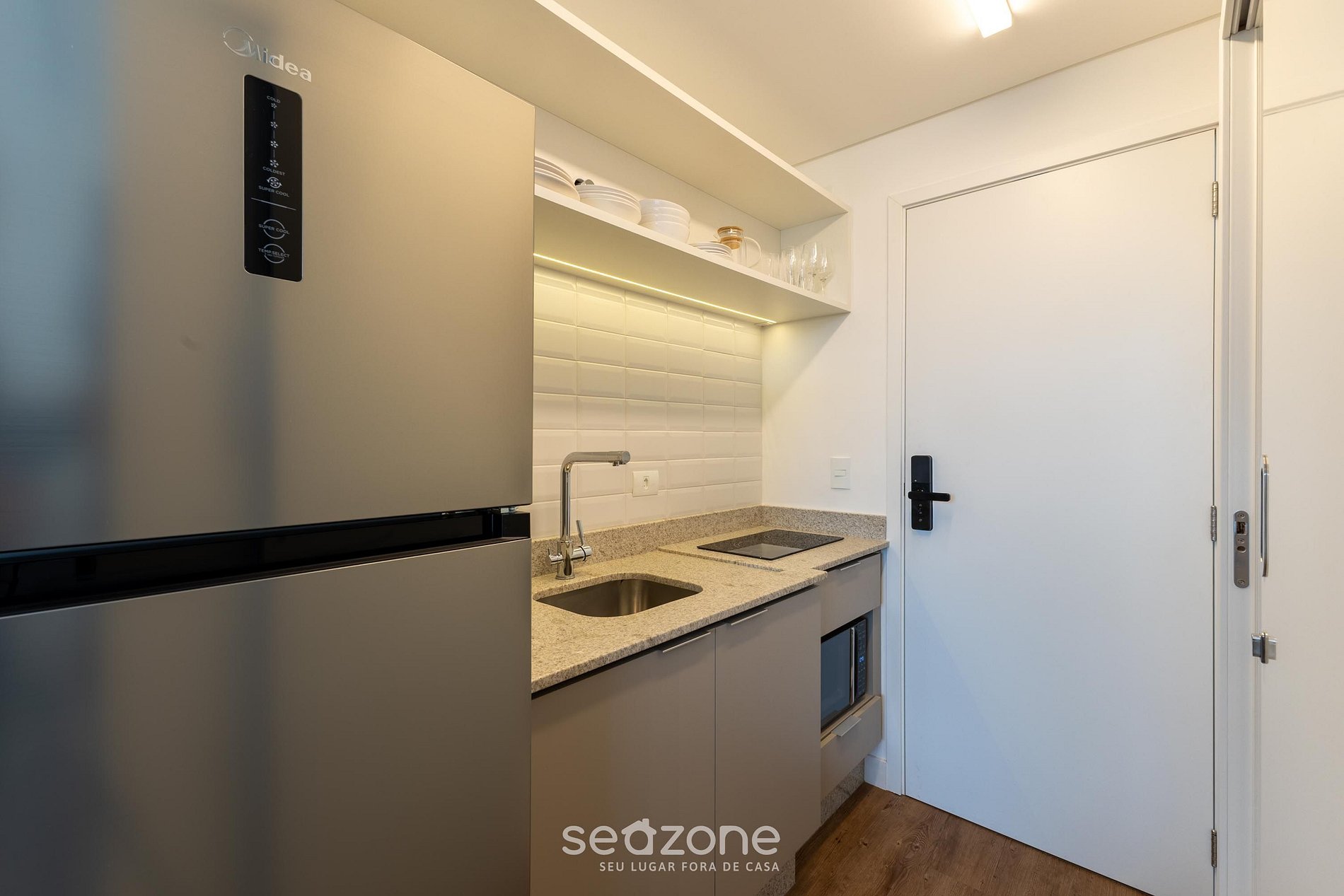 - Cozinha completa com geladeira, fogão cooktop (indução), micro-ondas, sanduicheira, cafeteira elétrica, chaleira elétrica, liquidificador, taças de vinho, panelas, louças e utensílios;