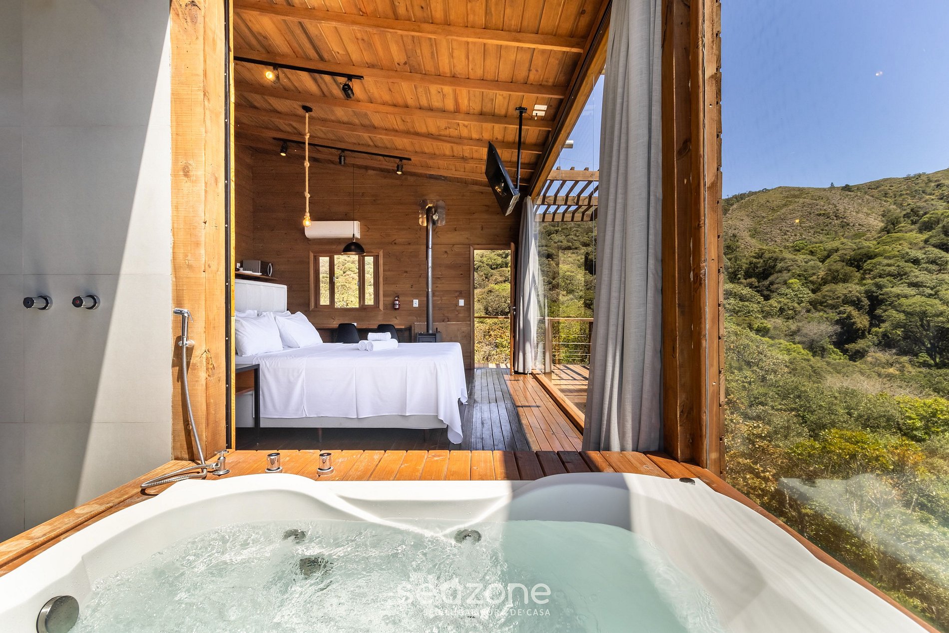 Unindo o rústico ao sofisticado, essa cabana é o ambiente ideal para uma hospedagem de luxo em meio a natureza. Além de aconchegante, oferece uma vista deslumbrante das montanhas, perfeita para aproveitar dias românticos a dois.