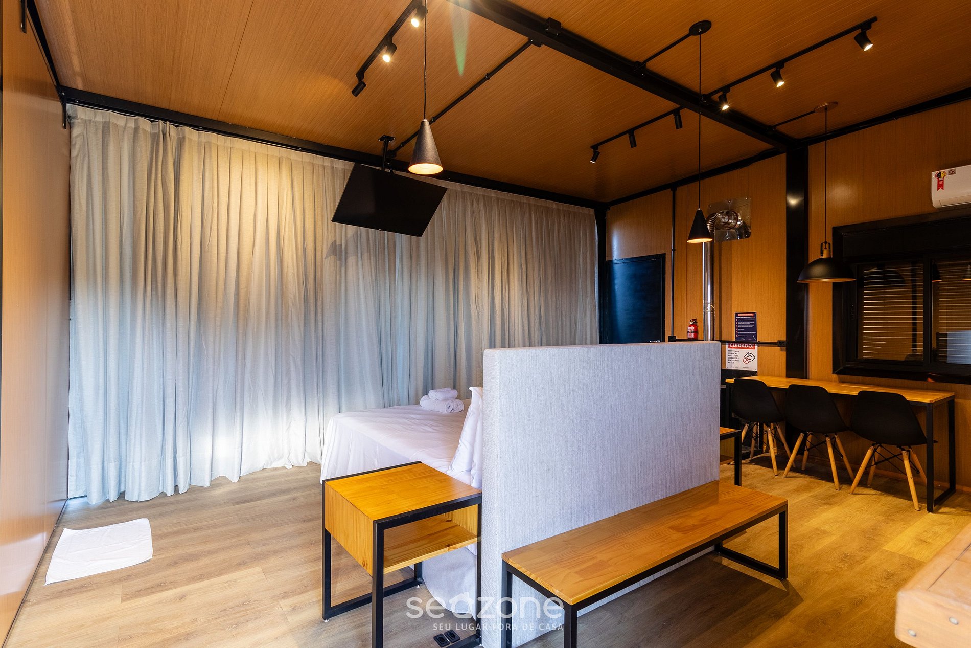 - Ambiente moderno em estilo industrial e conceito aberto, com mobília clean de alto padrão;