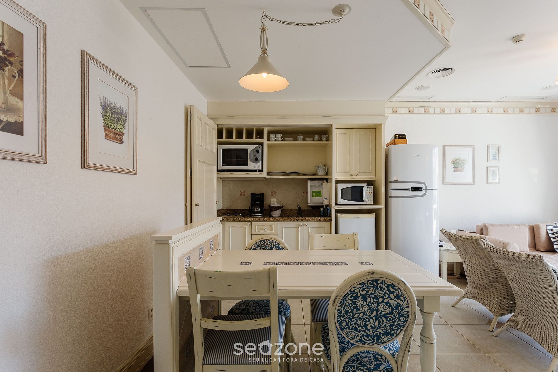 - Mini cozinha com fogão cooktop, micro-ondas, geladeira, frigobar, cafeteira e utensílios domésticos;