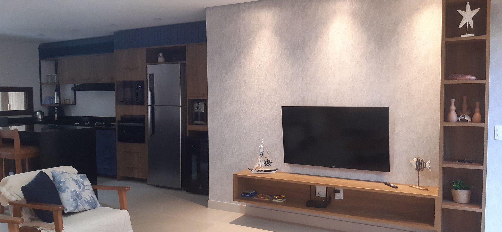 - Sala de estar com Sofá, Smart TV e ventilador portátil;
