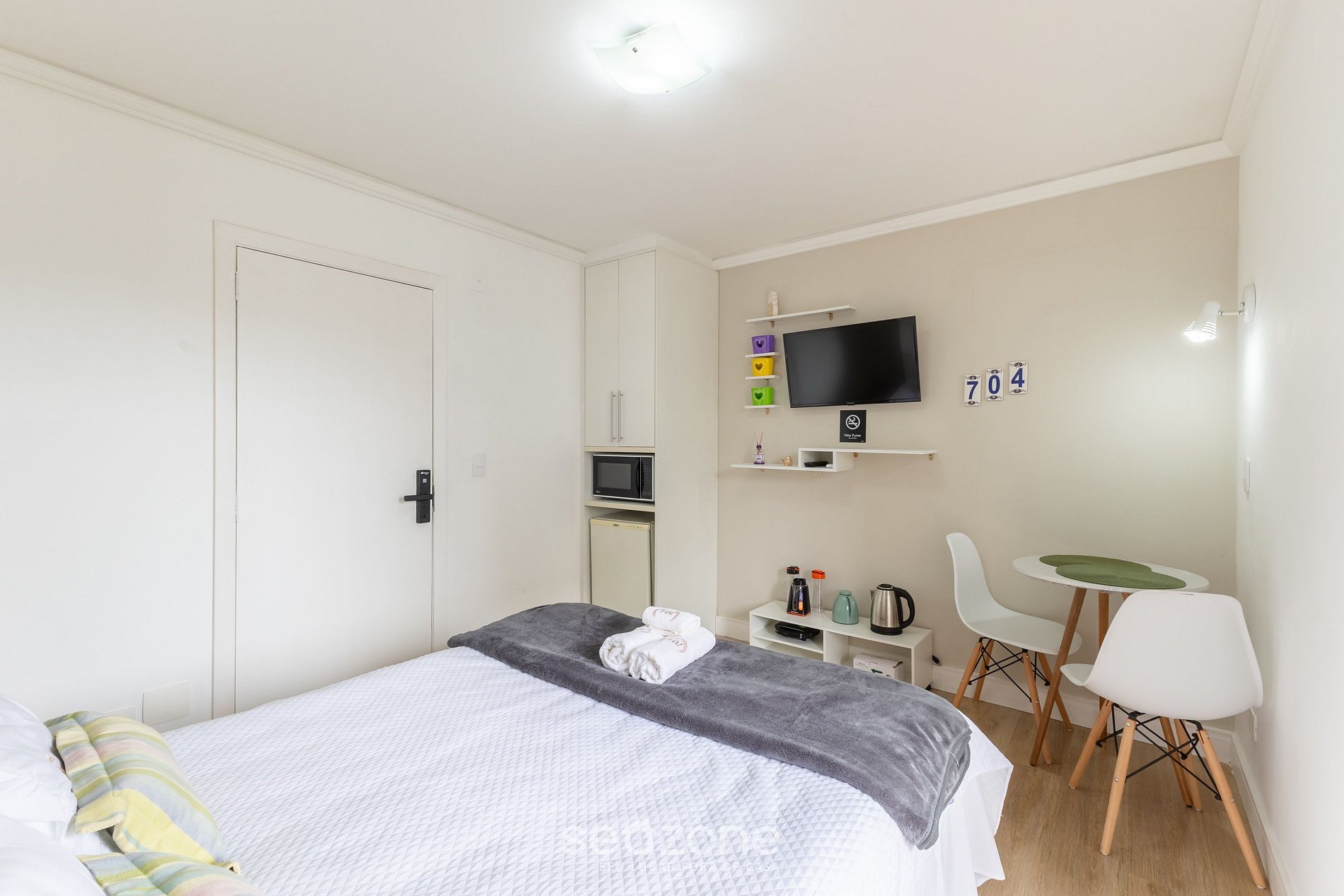- Estúdio com 1 cama de casal, armário, Smart TV e ar-condicionado;