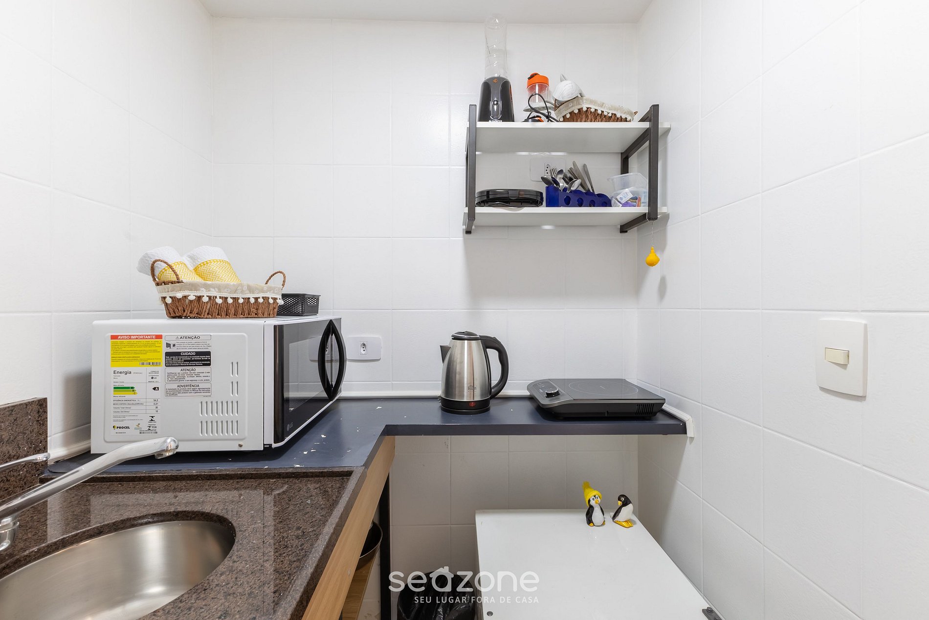 - Cozinha compacta com frigobar, fogão de indução, micro-ondas, sanduicheira, chaleira elétrica, liquidificador, kit café (suporte para filtro e garrafa térmica), panelas, louças e utensílios;
