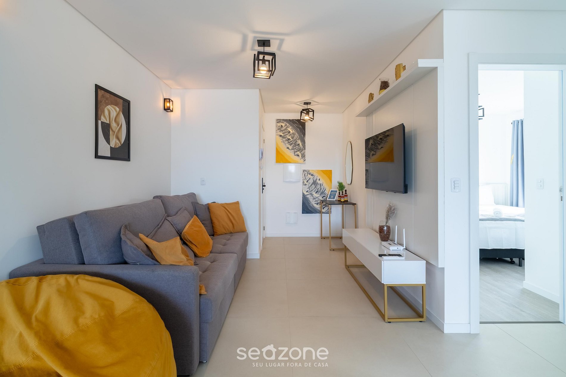 - Sala de estar com sofá, Smart TV e ar-condicionado;