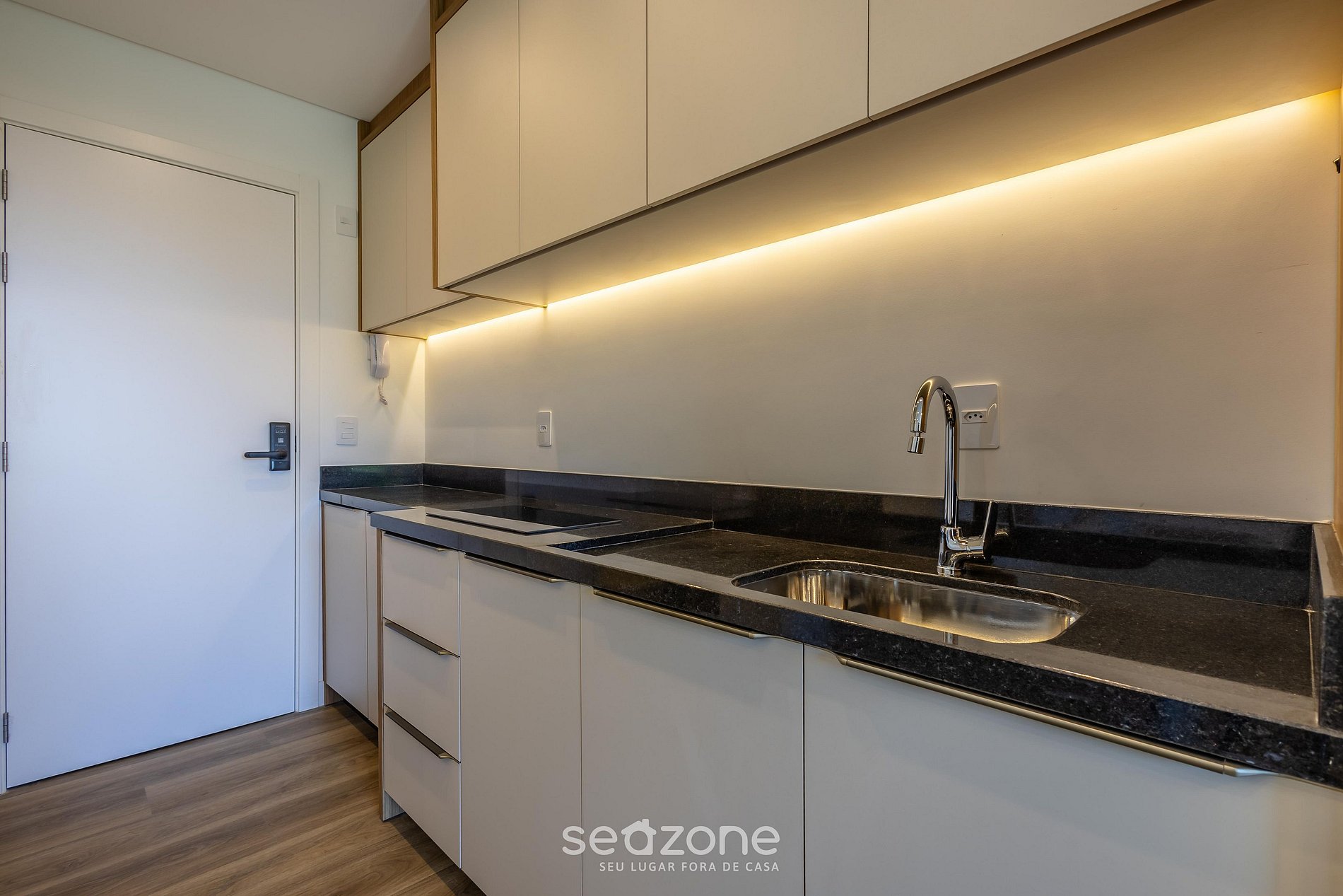 - Cozinha compacta com frigobar, fogão cooktop (indução), micro-ondas, sanduicheira, cafeteira elétrica, chaleira elétrica, liquidificador, taças de vinho, panelas, louças e utensílios;