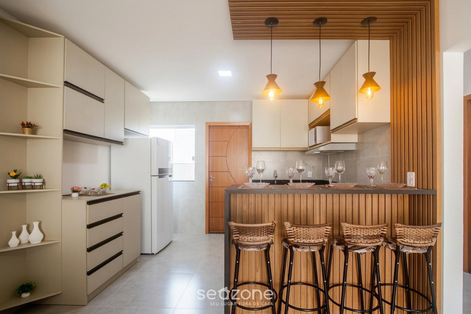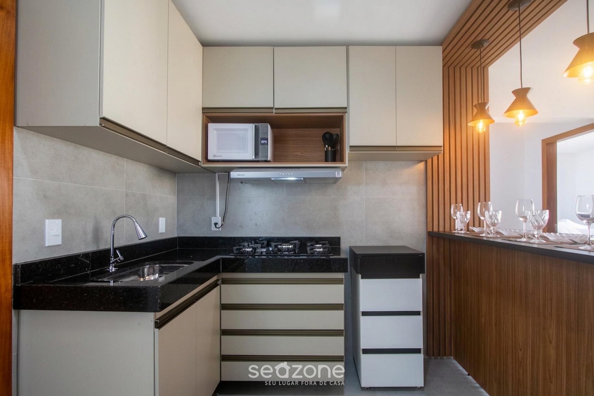 - Cozinha completa com geladeira, freezer, cooktop a gás, airfryer, micro-ondas, sanduicheira, chaleira elétrica, liquidificador, kit café, panelas, louças e utensílios;