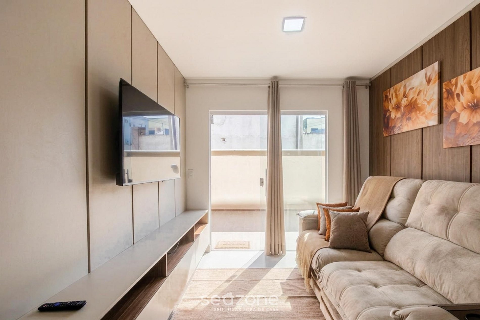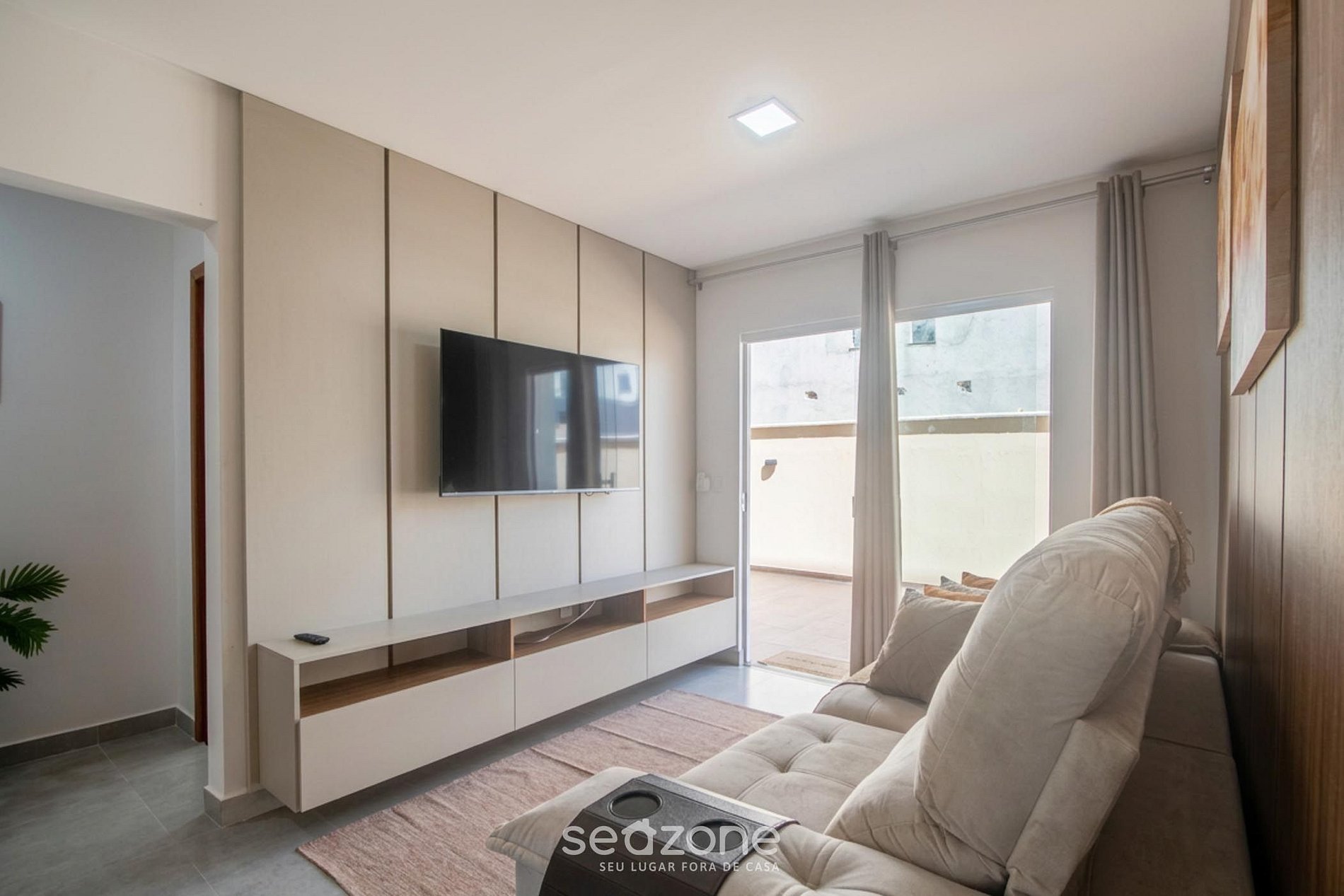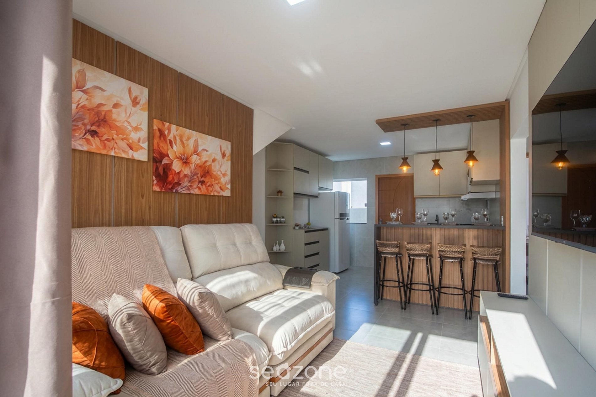 - Sala de estar com sofá e Smart TV;