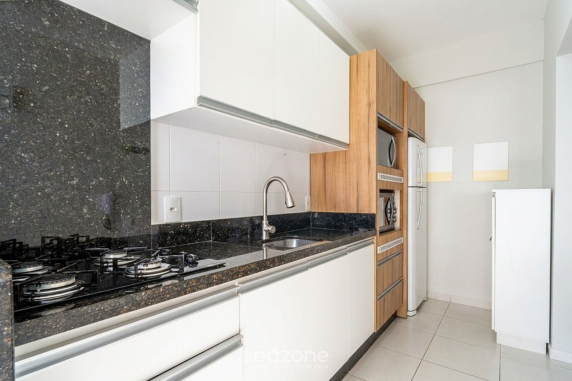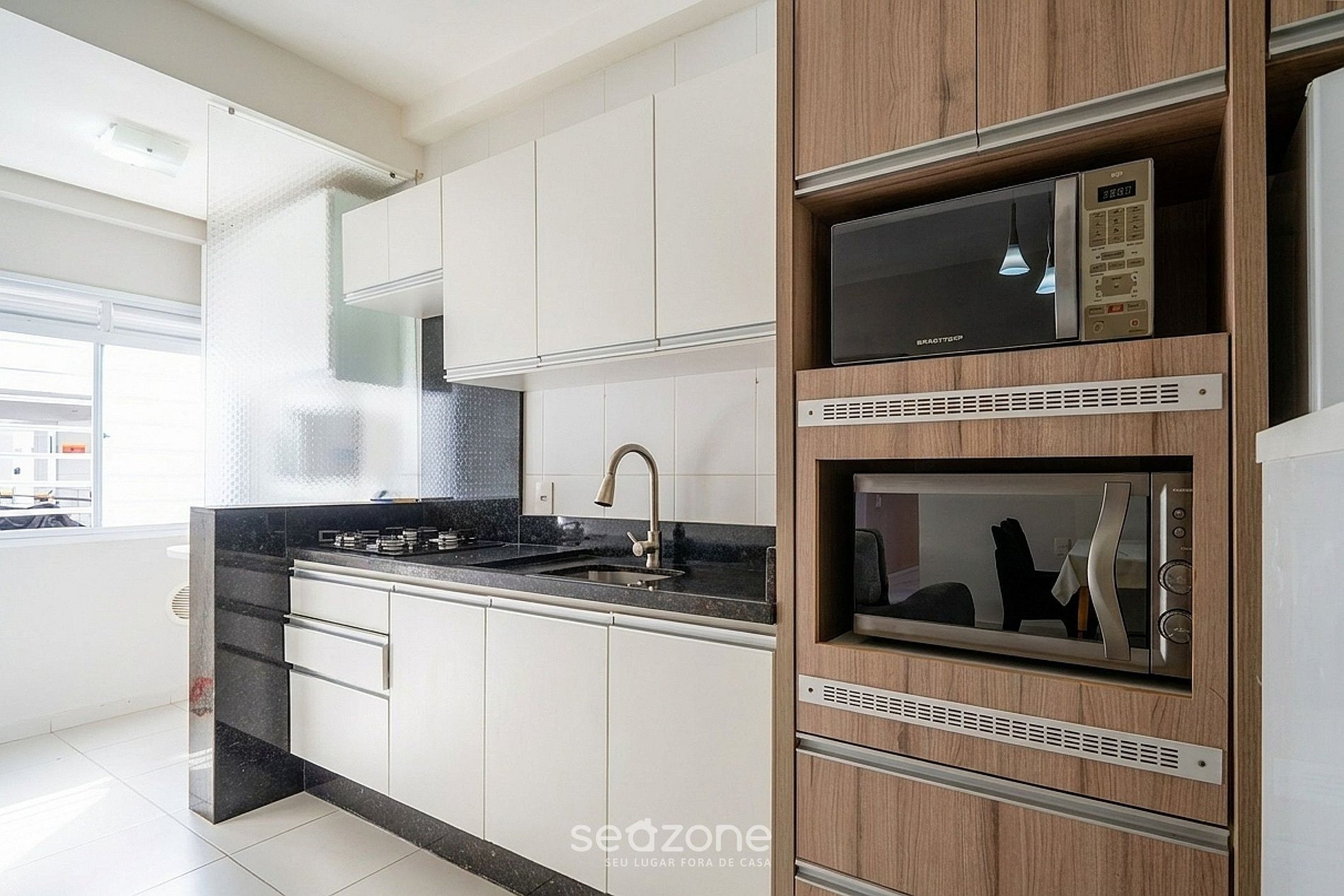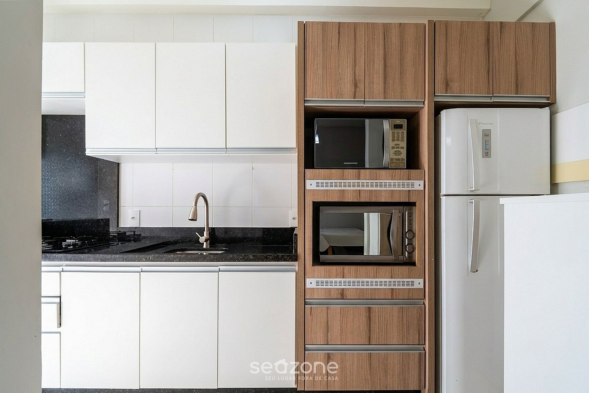 - Cozinha completa com geladeira, freezer, fogão, forno, micro-ondas, sanduicheira, liquidificador, cafeteira, chaleira, pratos, xícaras, copos, talheres, panelas, frigideira, utensílios de cozinha e lixeira de lixo seco;
