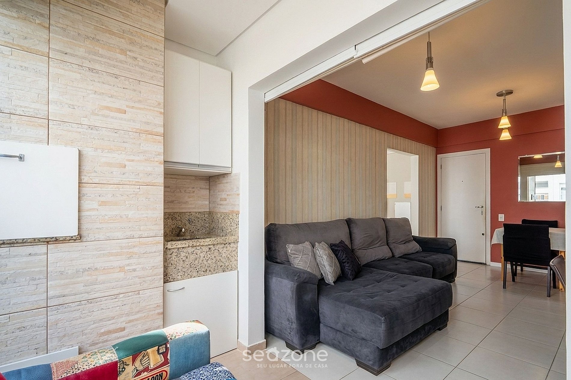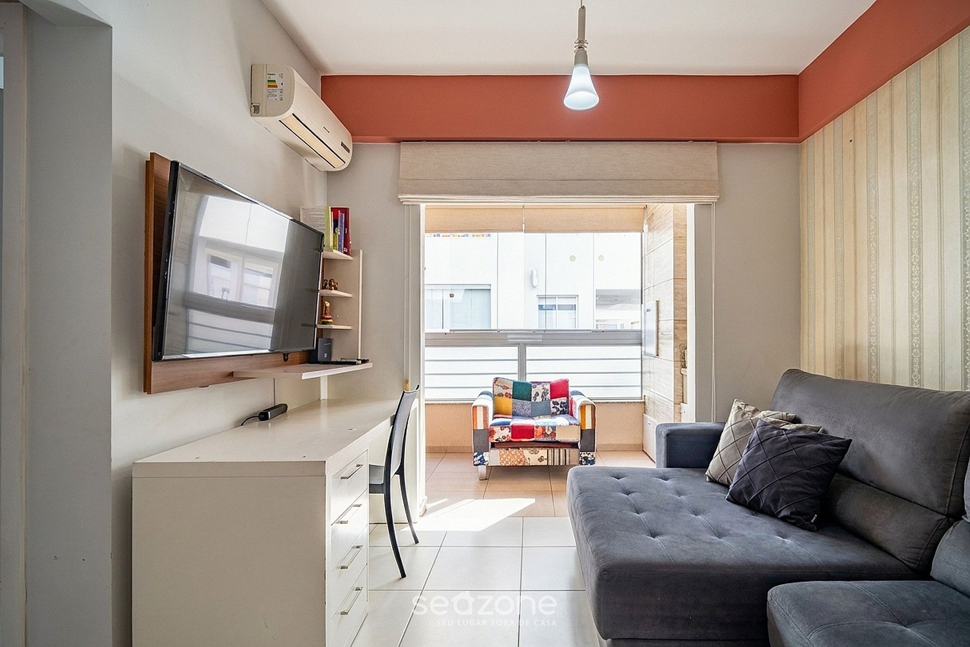 - Sala de estar com sofá, televisão, mesa e cadeiras, ar-condicionado e cortina;