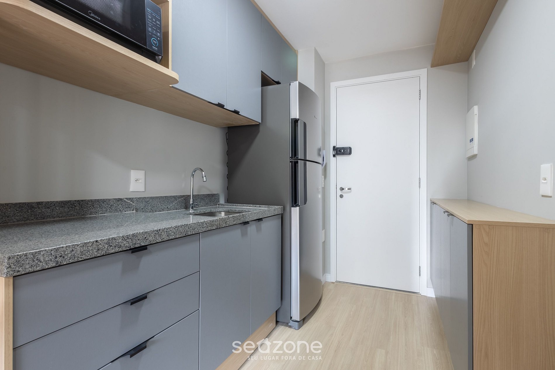 - Cozinha compacta com geladeira, fogão cooktop elétrico, micro-ondas, sanduicheira, cafeteira elétrica, chaleira elétrica, taças de vinho, panelas, louças e utensílios;