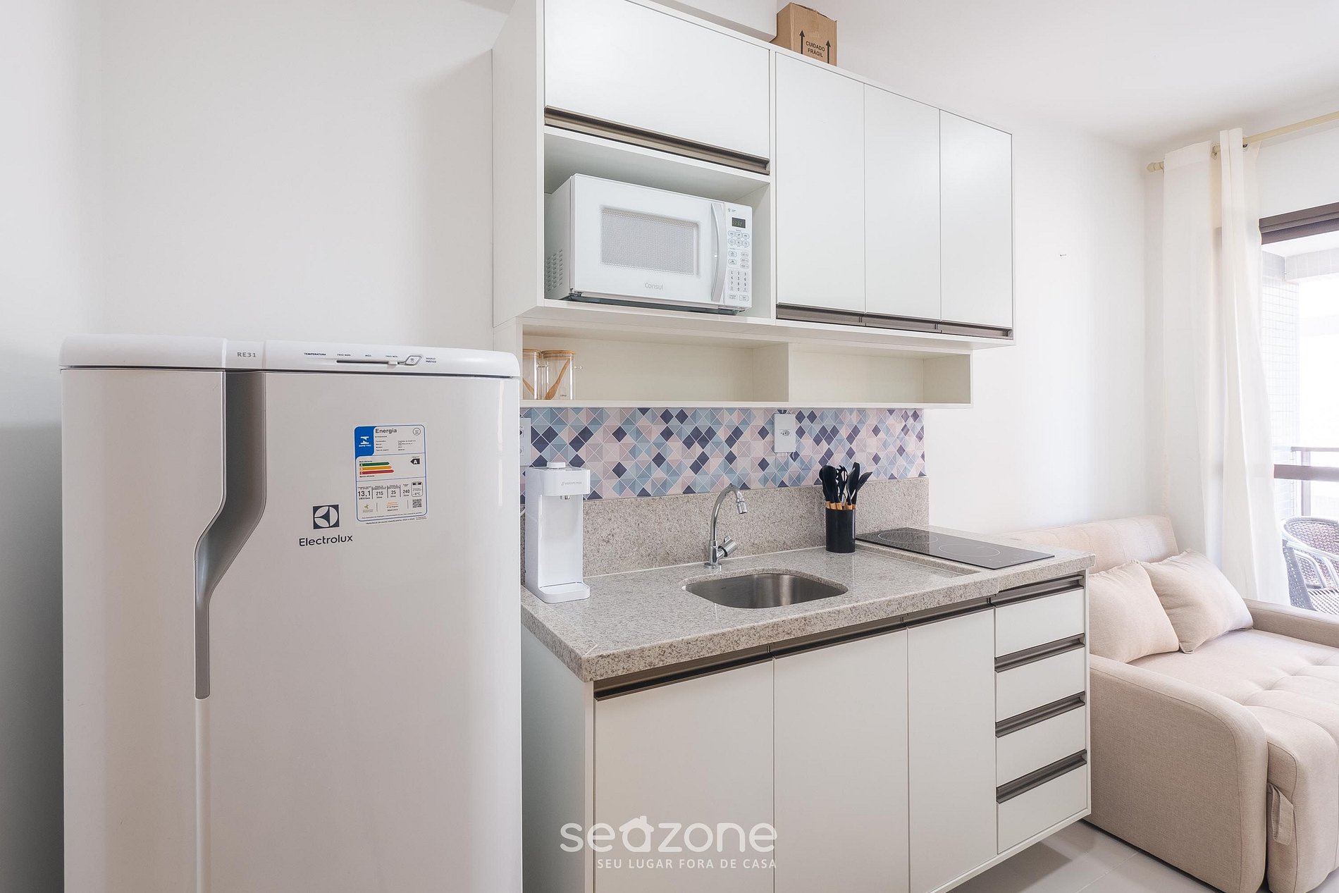 - Cozinha com geladeira, fogão cooktop (indução), micro-ondas, airfryer, sanduicheira, cafeteira (suporte para filtro e garrafa térmica), chaleira elétrica, liquidificador, taças de vinho, panelas e utensílios;