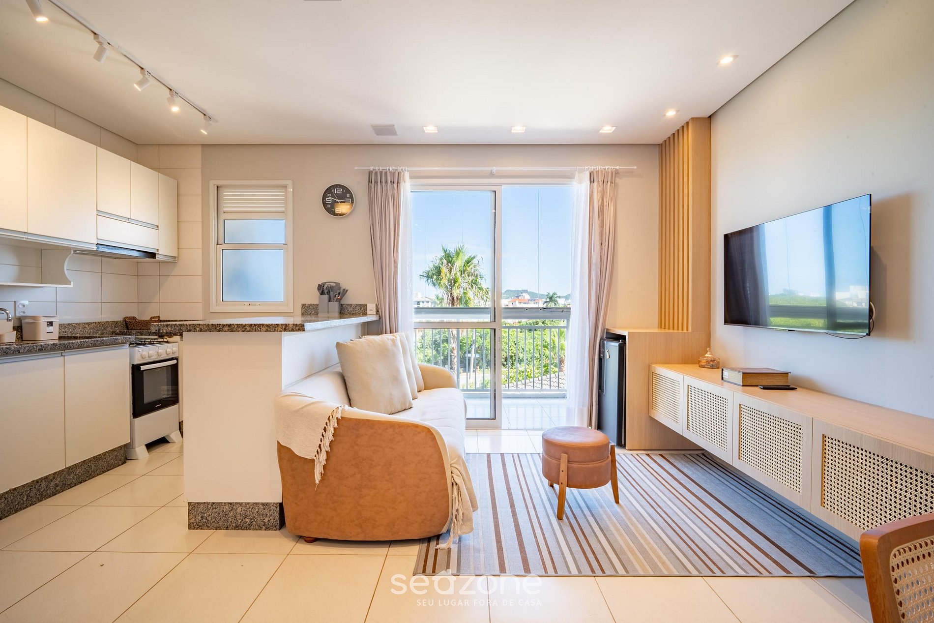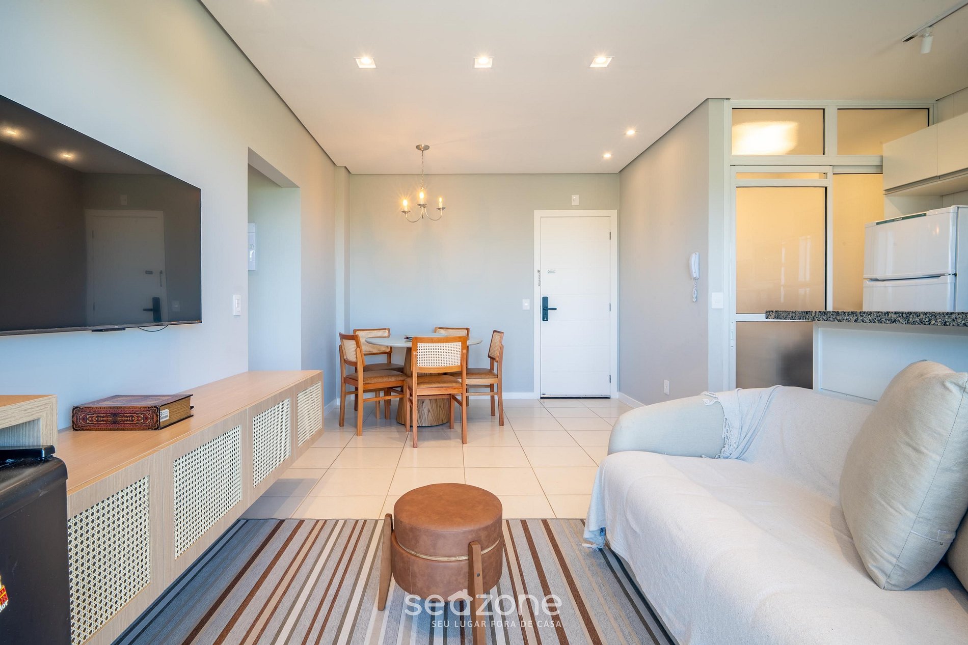 - Sala de estar com sofá e Smart TV;