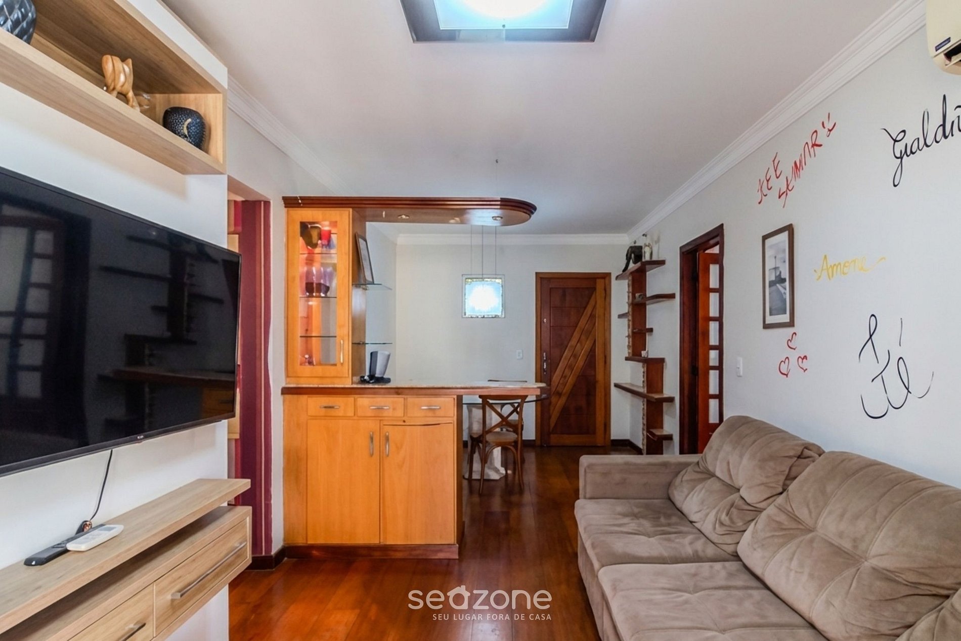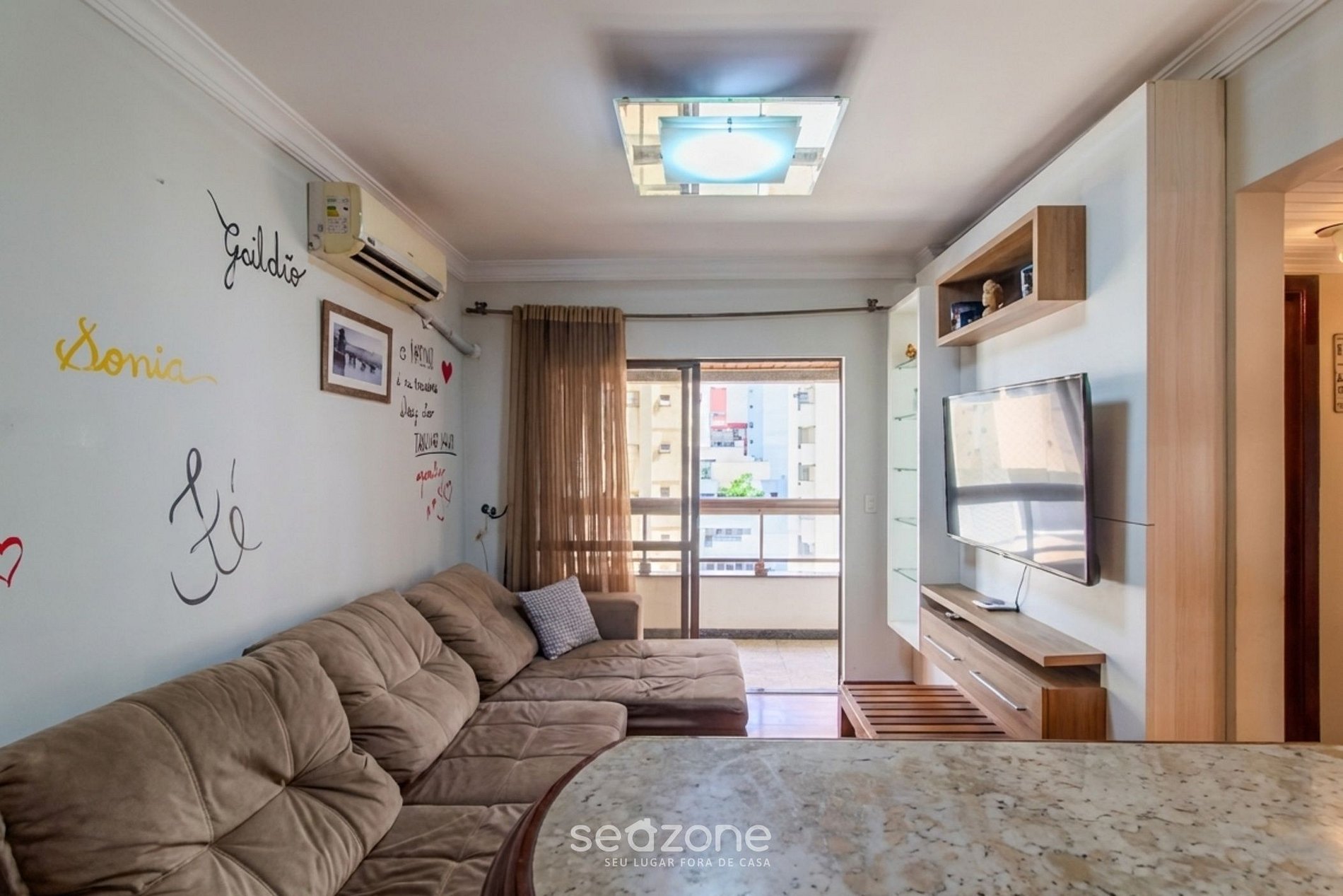 - Sala de estar com sofá, Smart TV e ar-condicionado split;