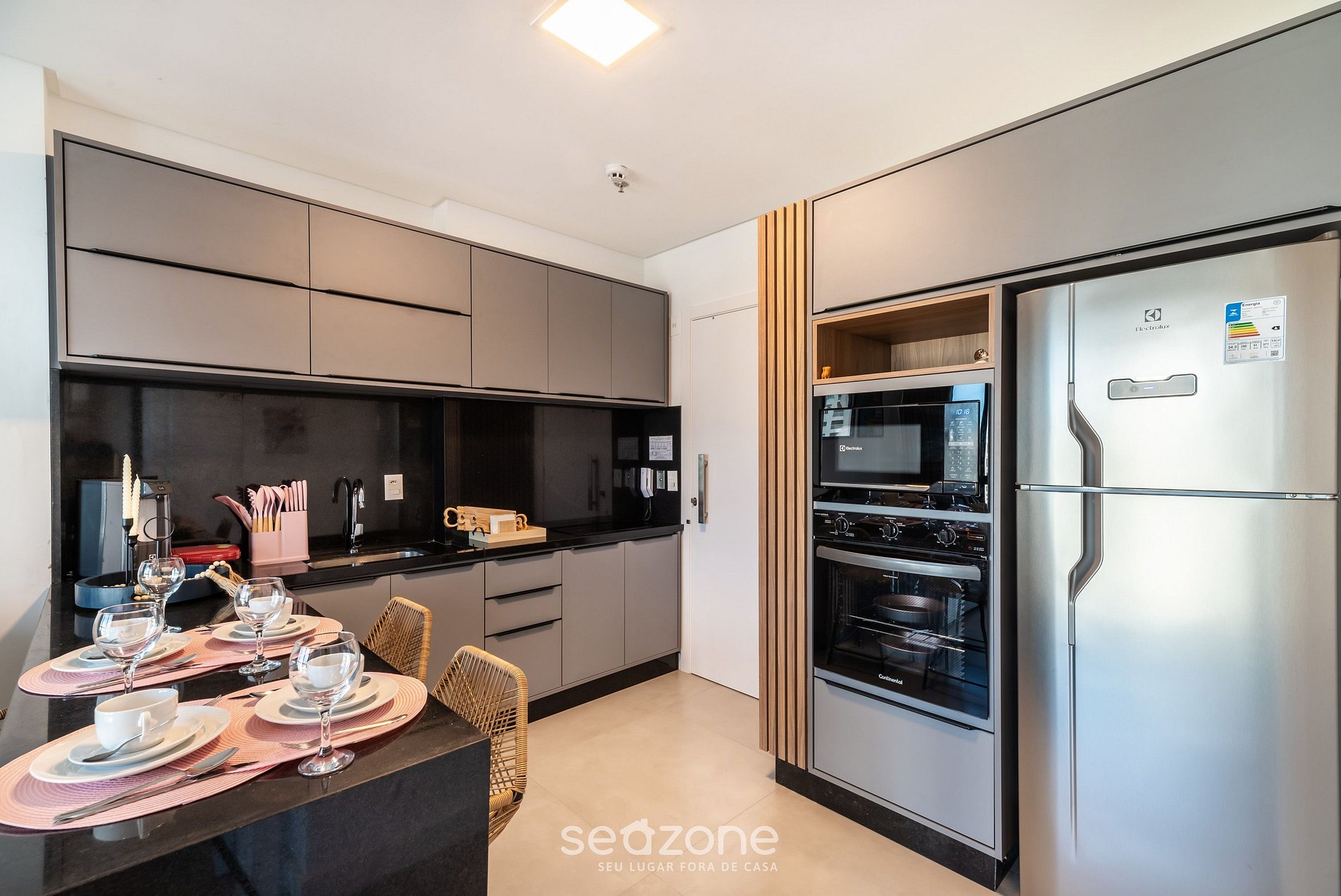 - Cozinha completa com geladeira, cooktop de indução, forno elétrico, micro-ondas, sanduicheira, cafeteira elétrica, liquidificador, chaleira elétrica, taças de vinho, panelas, louças e utensílios;