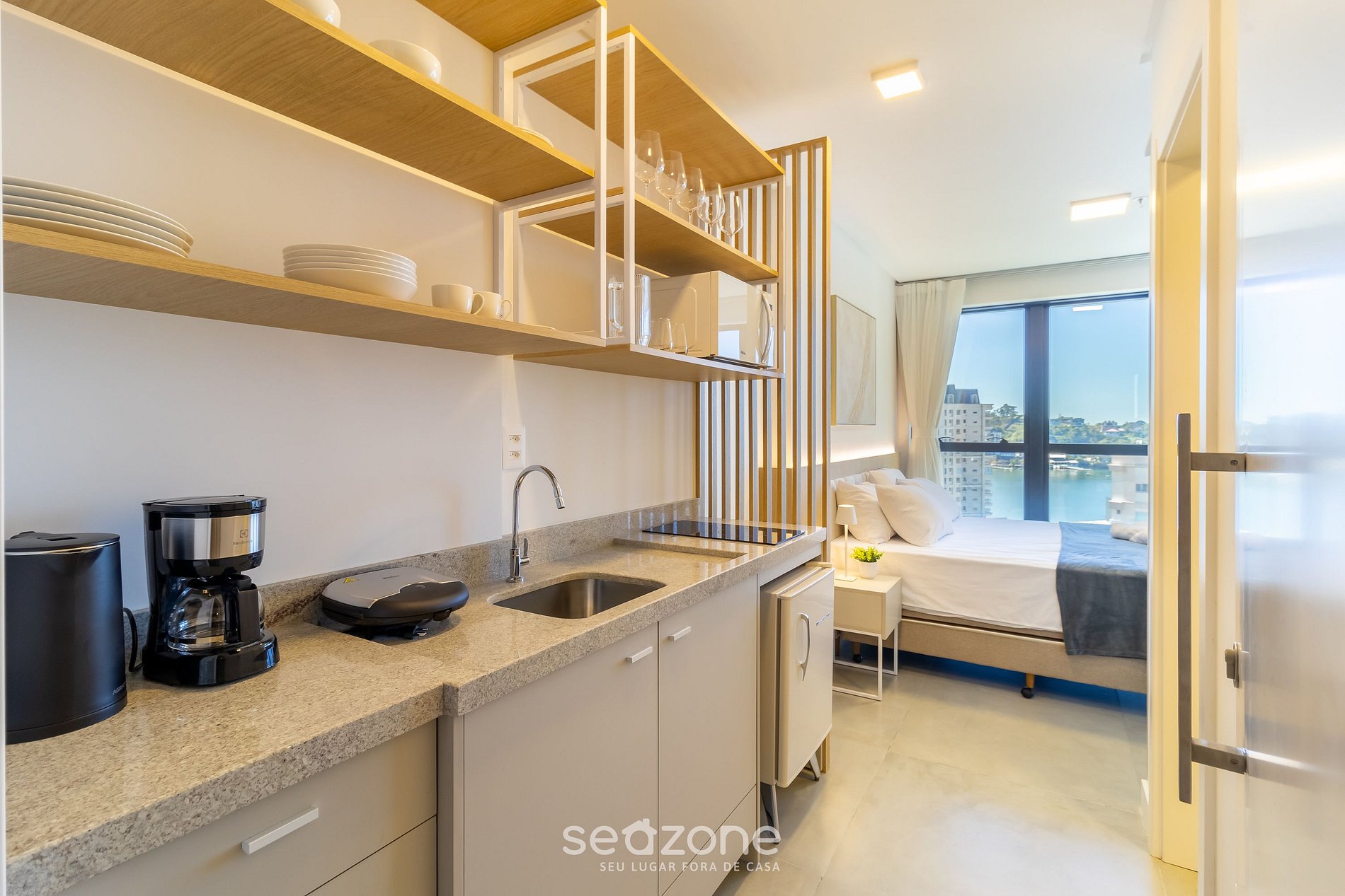 - Cozinha compacta com micro-ondas (sua opção prática para refeições rápidas durante a estadia), além de frigobar, cafeteira, chaleira elétrica, taças de vinho, louças e utensílios essenciais para o dia a dia;