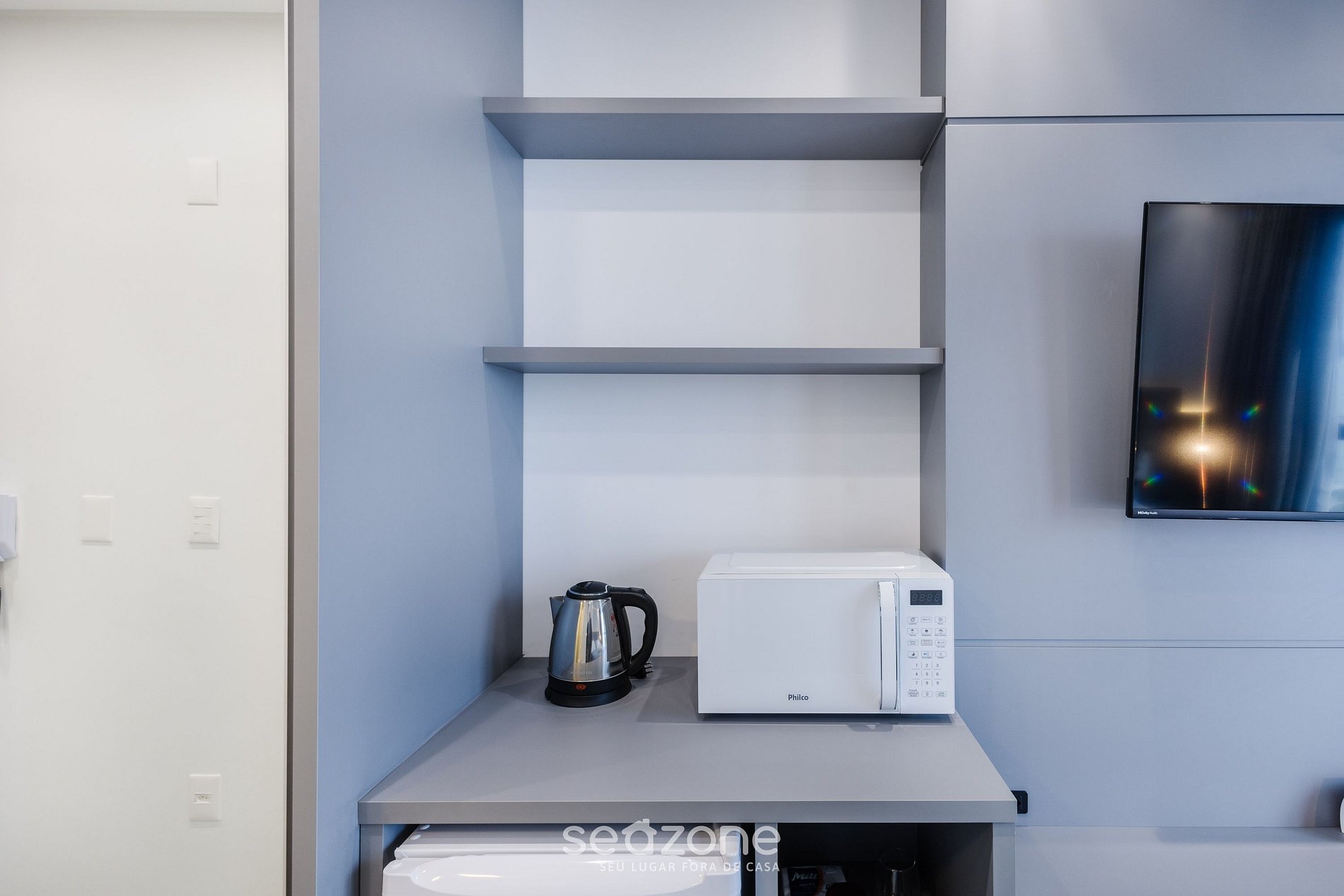 - Cozinha compacta com micro-ondas (sua opção prática para refeições rápidas durante a estadia), além de frigobar, cafeteira, chaleira elétrica, taças de vinho, louças e utensílios essenciais para o dia a dia;