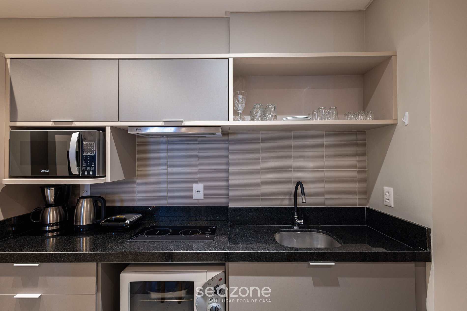 - Cozinha completa com geladeira, cooktop de indução, forno elétrico, micro-ondas, sanduicheira, cafeteira elétrica, chaleira elétrica, taças de vinho, panelas, louças e utensílios;