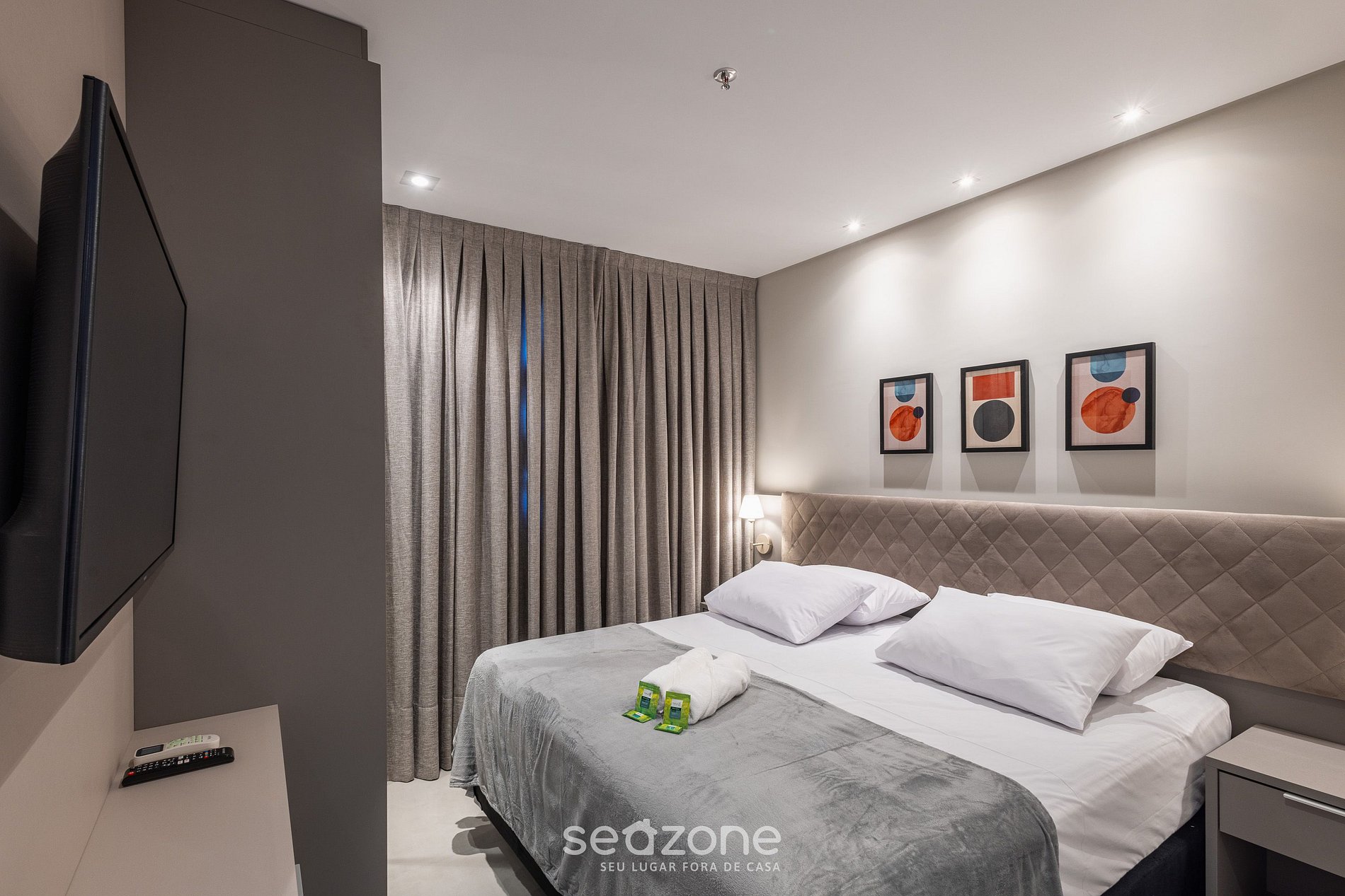 - 1 Quarto com cama de casal queen size, cortinas blackout, guarda-roupa, cômoda, Smart TV de tela plana e ar-condicionado;