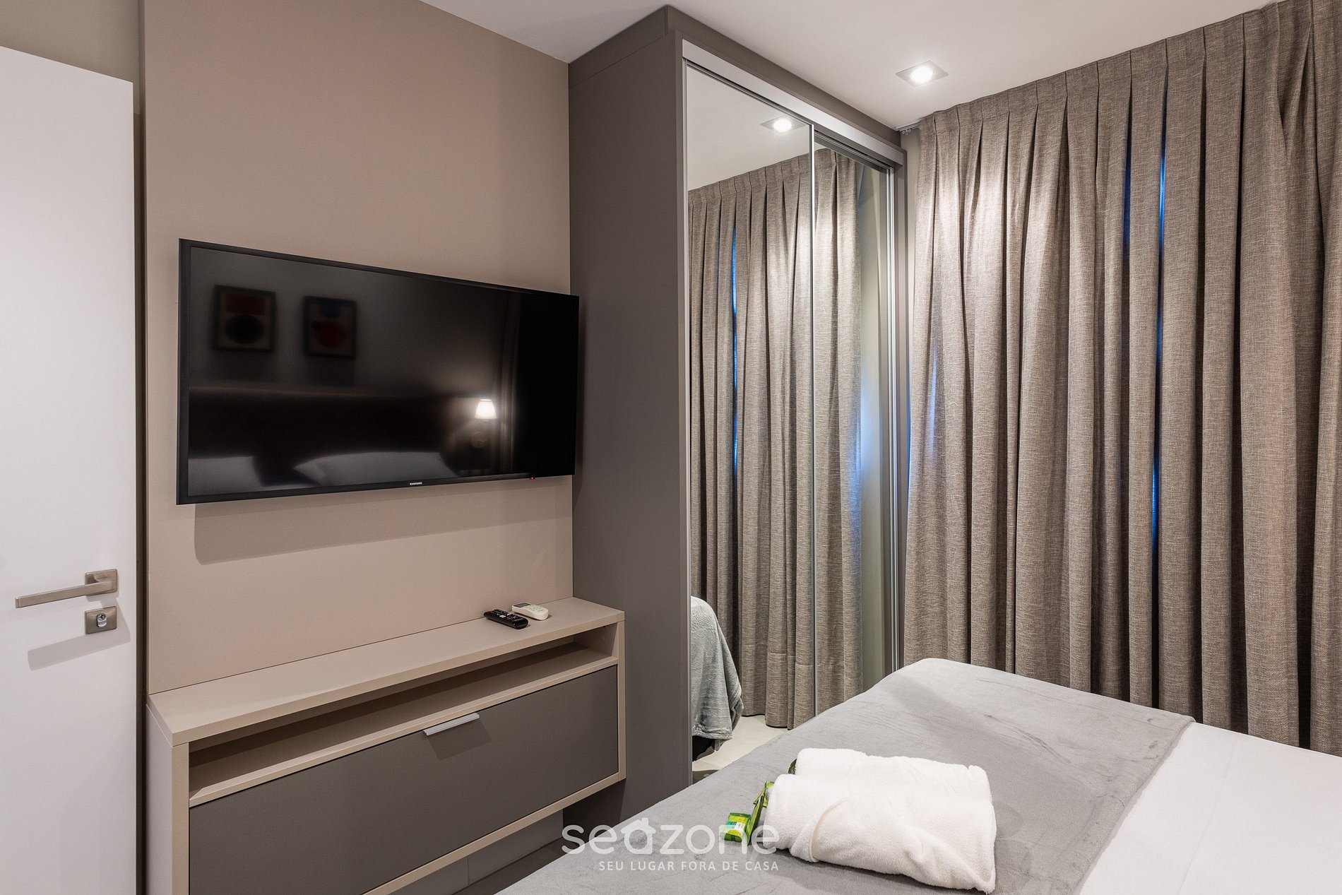 - 1 Quarto com cama de casal queen size, cortinas blackout, guarda-roupa, cômoda, Smart TV de tela plana e ar-condicionado;