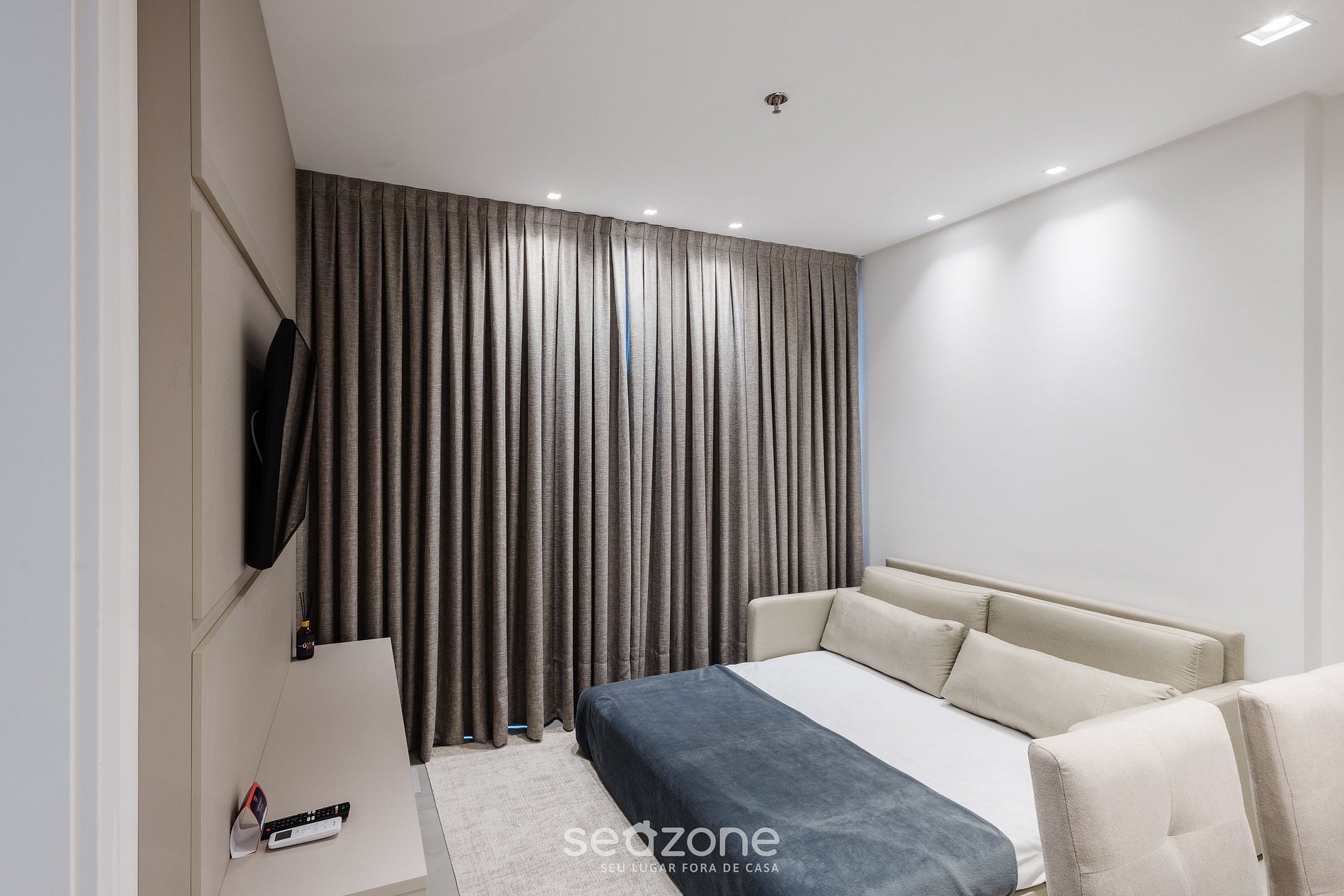 - Sala de estar com sofá-cama de casal, cortinas blackout, Smart TV de tela plana e ar-condicionado;