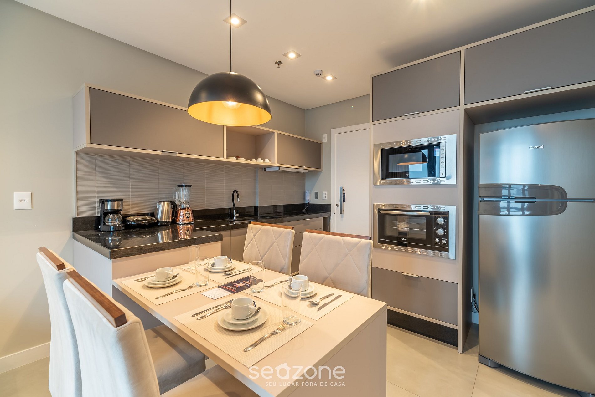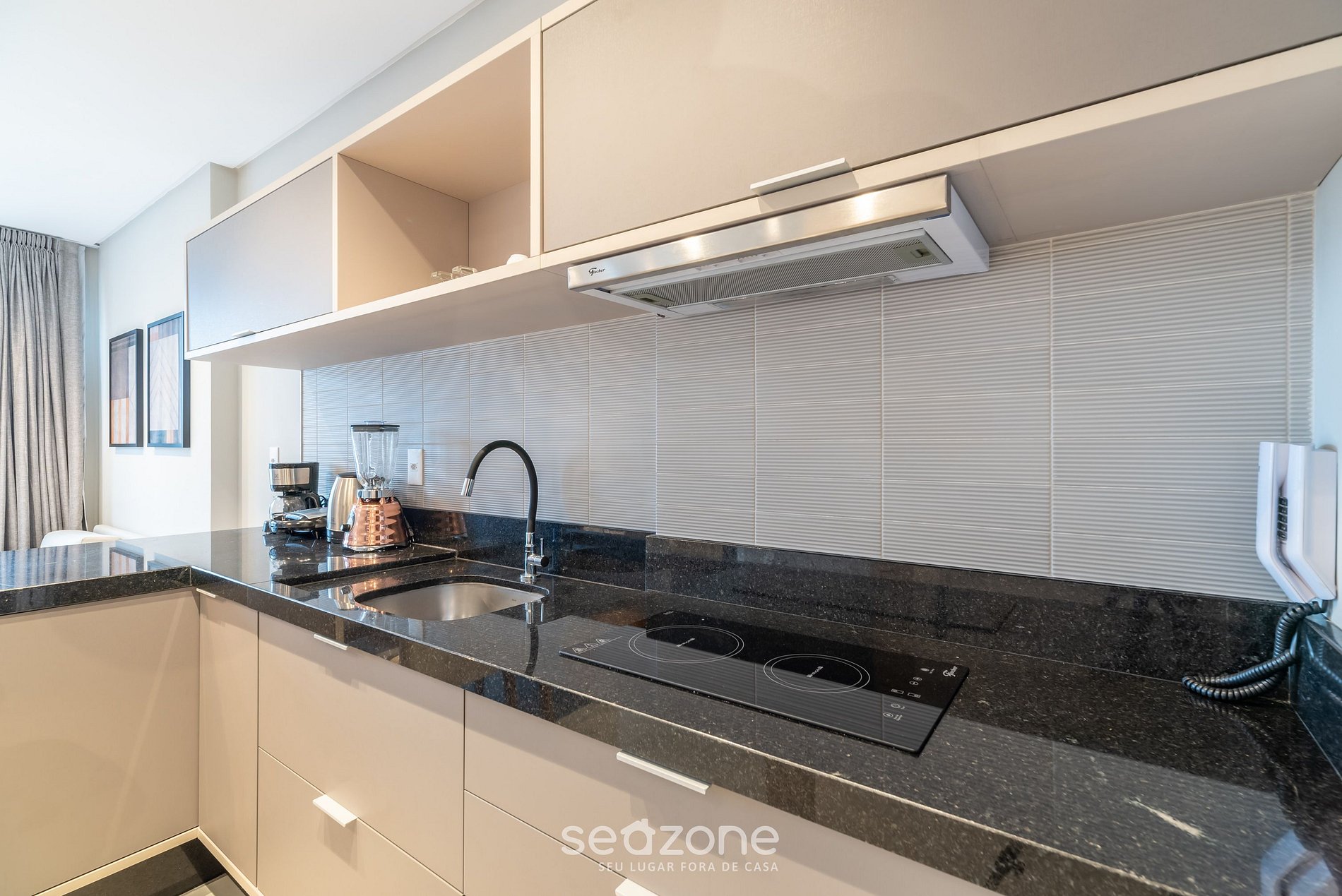 - Cozinha completa com geladeira, cooktop de indução, forno elétrico, micro-ondas, sanduicheira, cafeteira elétrica, chaleira elétrica, taças de vinho, panelas, louças e utensílios;