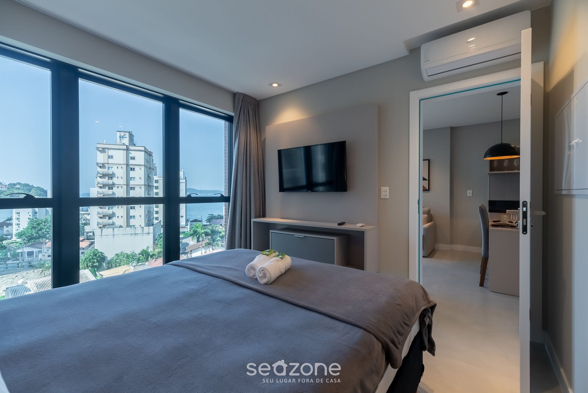 - 1 Quarto com cama de casal queen size, cortinas blackout, guarda-roupa, cômoda, Smart TV de tela plana e ar-condicionado;