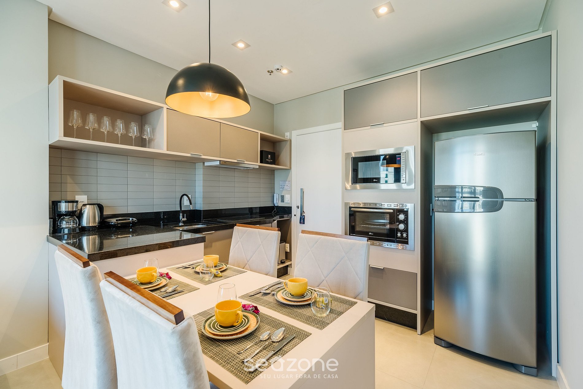 - Cozinha completa com geladeira, cooktop de indução, forno elétrico, micro-ondas, sanduicheira, cafeteira elétrica, chaleira elétrica, taças de vinho, panelas, louças e utensílios;