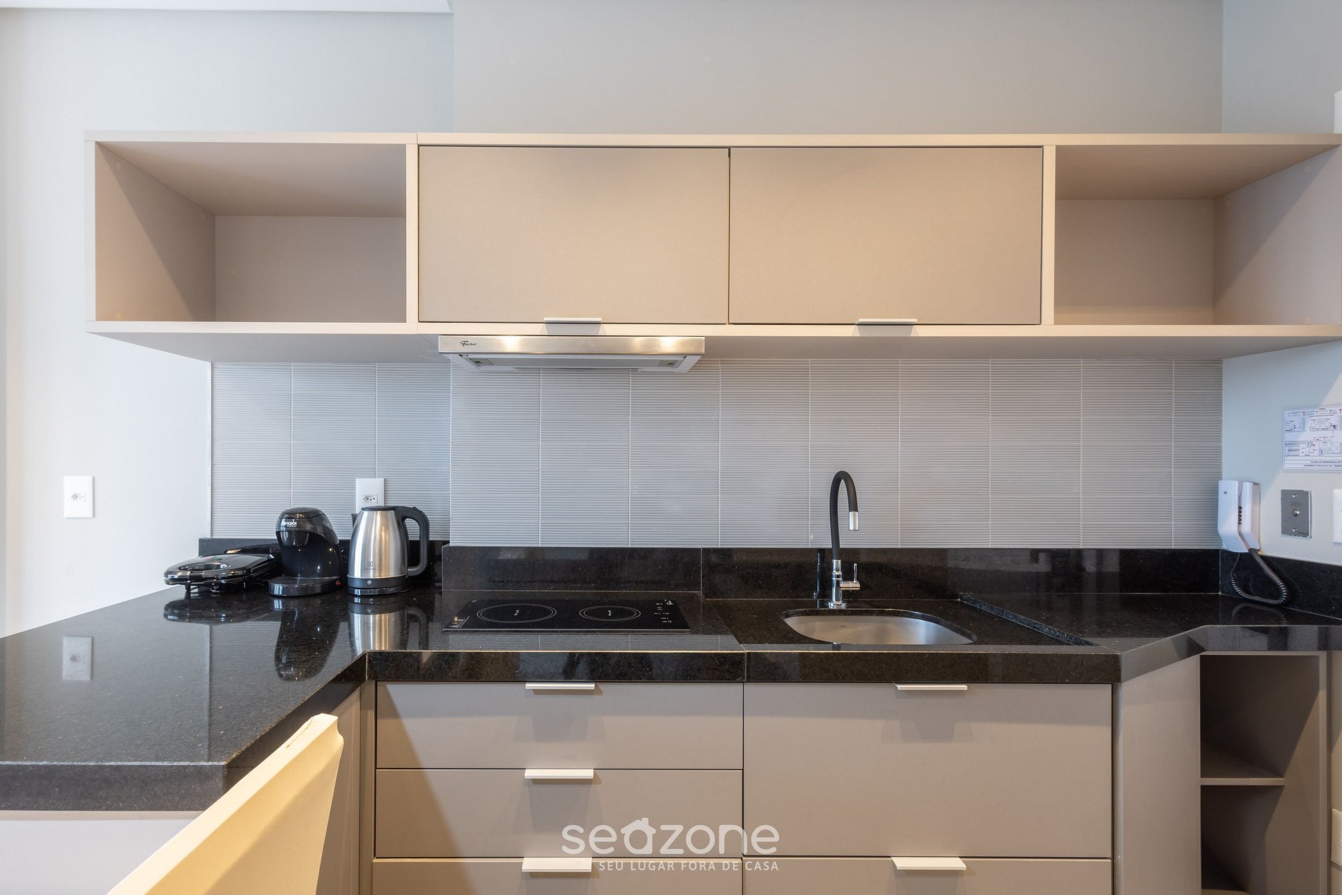- Cozinha completa com geladeira, cooktop de indução, forno elétrico, micro-ondas, sanduicheira, cafeteira elétrica, chaleira elétrica, taças de vinho, panelas, louças e utensílios;