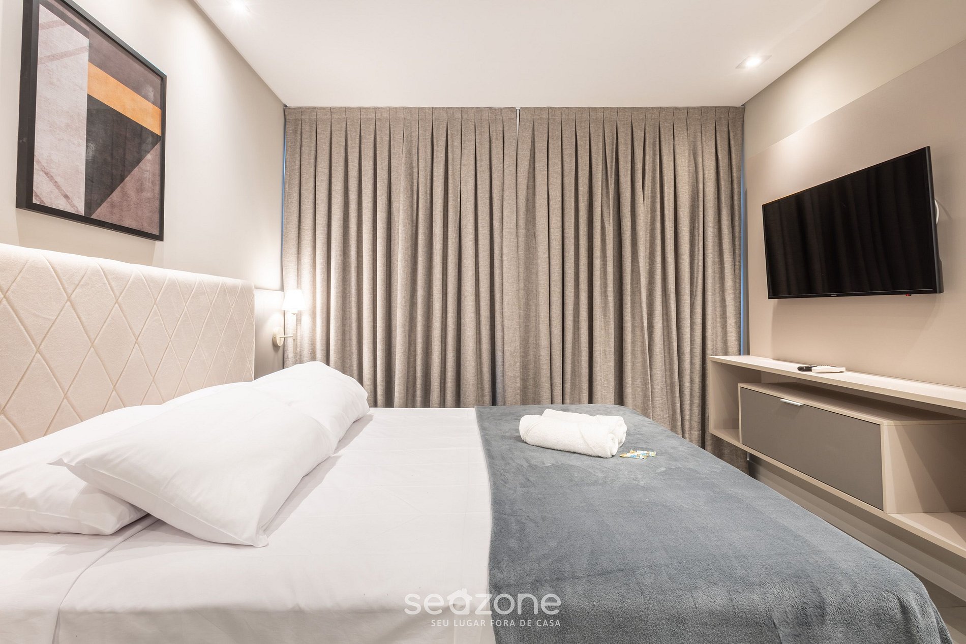 - 1 Quarto com cama de casal queen size, cortinas blackout, guarda-roupa, cômoda, Smart TV de tela plana e ar-condicionado;
