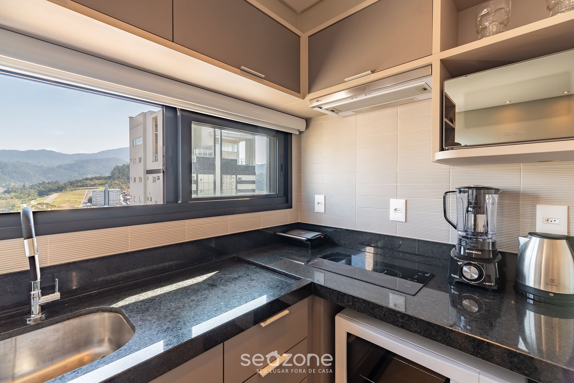 - Cozinha completa com geladeira, cooktop de indução, forno elétrico, micro-ondas, sanduicheira, cafeteira elétrica, chaleira elétrica, taças de vinho, panelas, louças e utensílios;