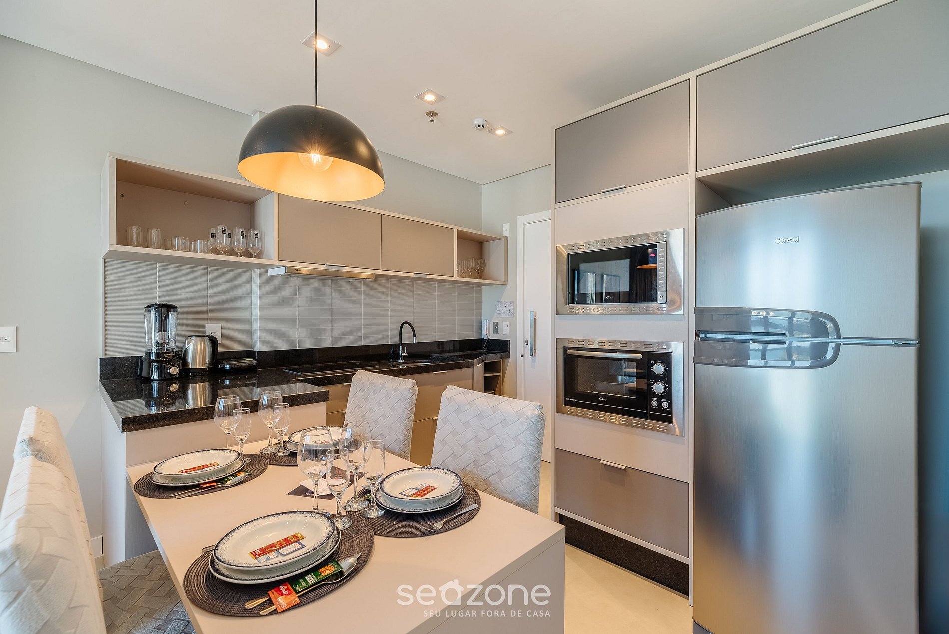 - Cozinha completa com geladeira, cooktop de indução, forno elétrico, micro-ondas, sanduicheira, cafeteira elétrica, chaleira elétrica, taças de vinho, panelas, louças e utensílios;