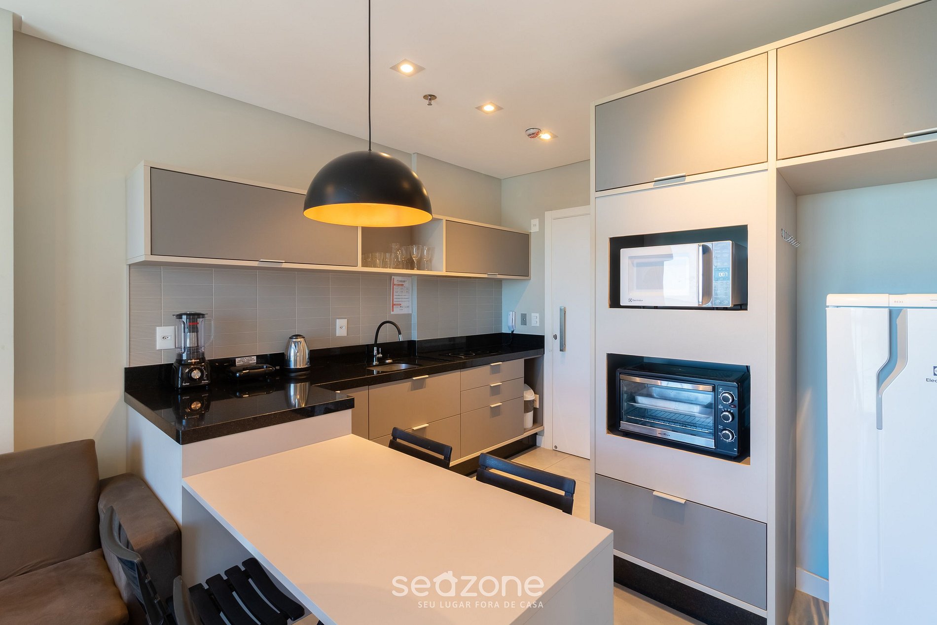 - Cozinha completa com geladeira, cooktop de indução, forno elétrico, micro-ondas, sanduicheira, cafeteira elétrica, chaleira elétrica, taças de vinho, panelas, louças e utensílios;