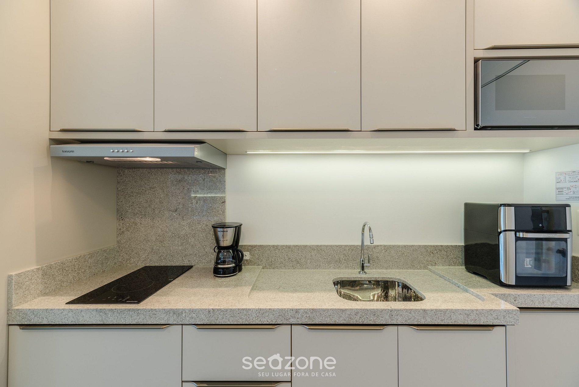 - Cozinha completa com geladeira, cooktop de indução, airfryer, micro-ondas, sanduicheira, cafeteira elétrica, chaleira elétrica, liquidificador, taças de vinho, panelas, louças e utensílios;