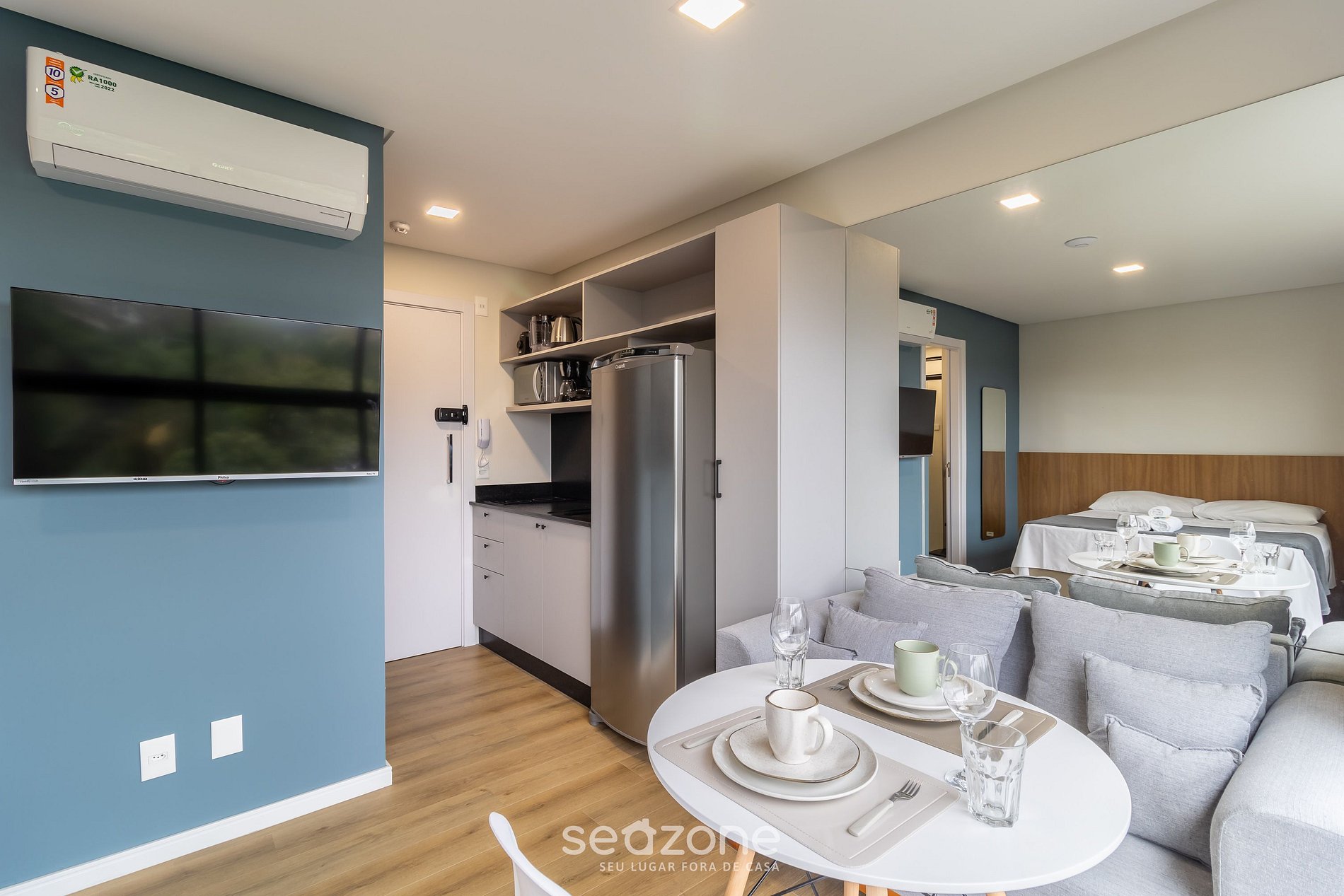 - 1 Cama de casal, armário, sofá, smart TV e ar-condicionado;