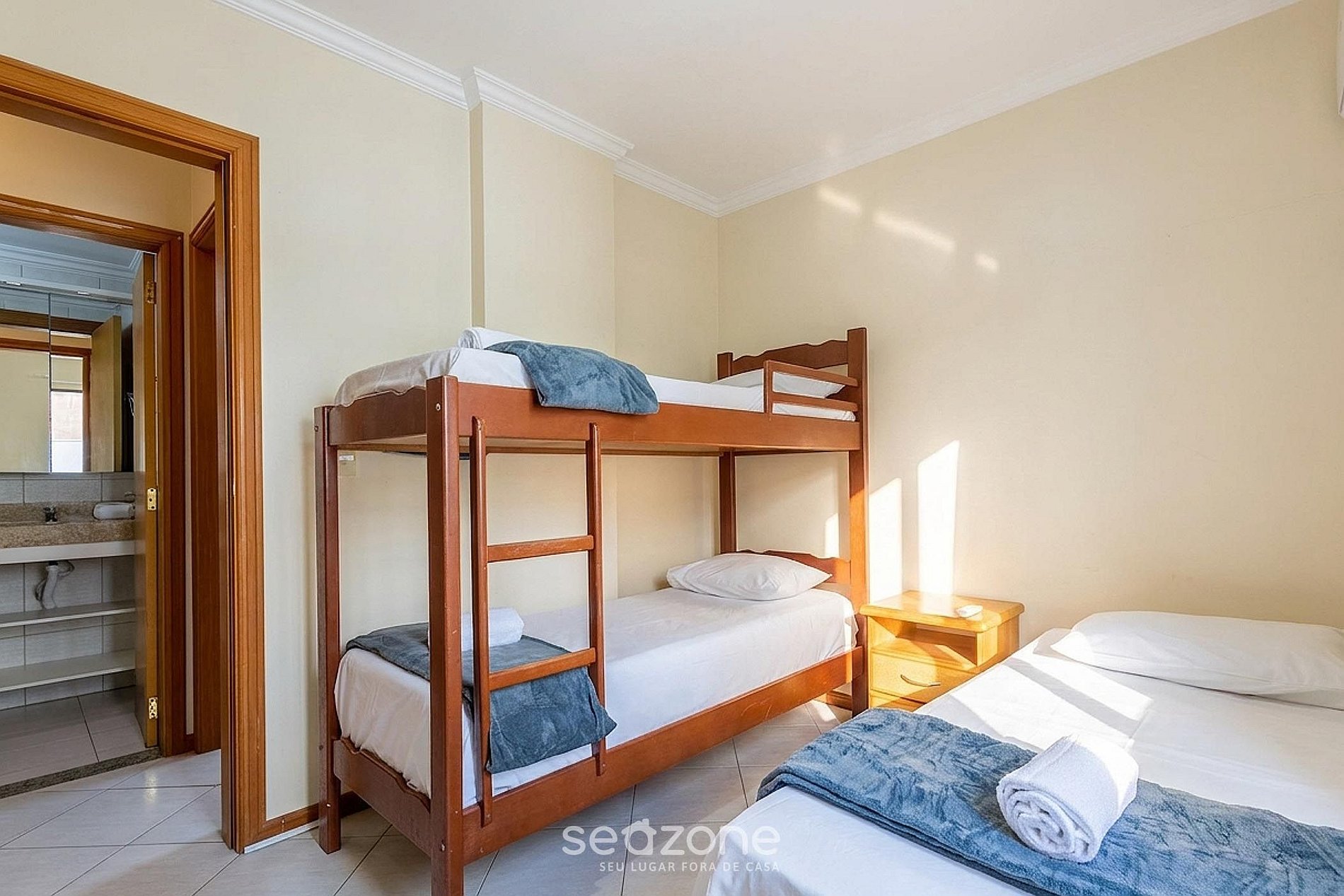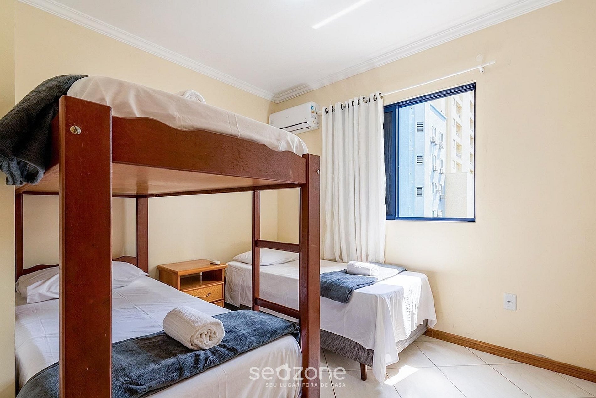 - 1 Quarto com 1 beliche, 1 cama de solteiro e ar-condicionado;