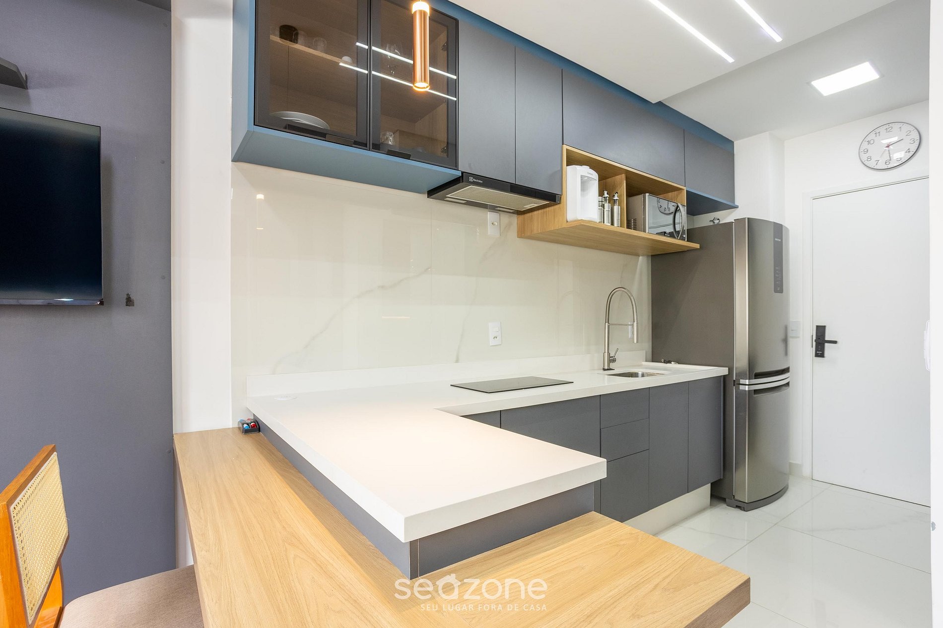 - Cozinha completa com geladeira, fogão de indução, micro-ondas, sanduicheira, kit café, chaleira elétrica, liquidificador, taças de vinho, panelas, louças e utensílios;