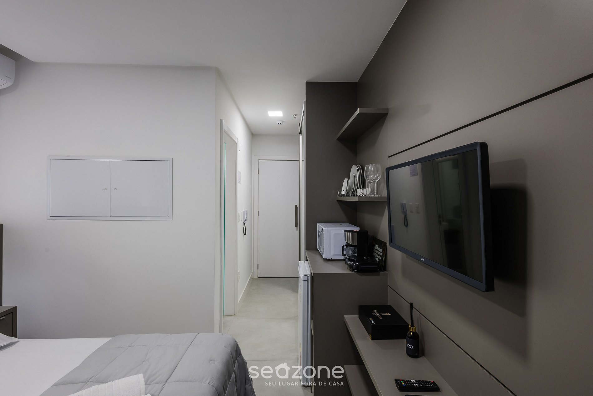 - Cozinha compacta com micro-ondas (sua opção prática para refeições rápidas durante a estadia), além de frigobar, cafeteira, chaleira elétrica, taças de vinho, louças e utensílios essenciais para o dia a dia;