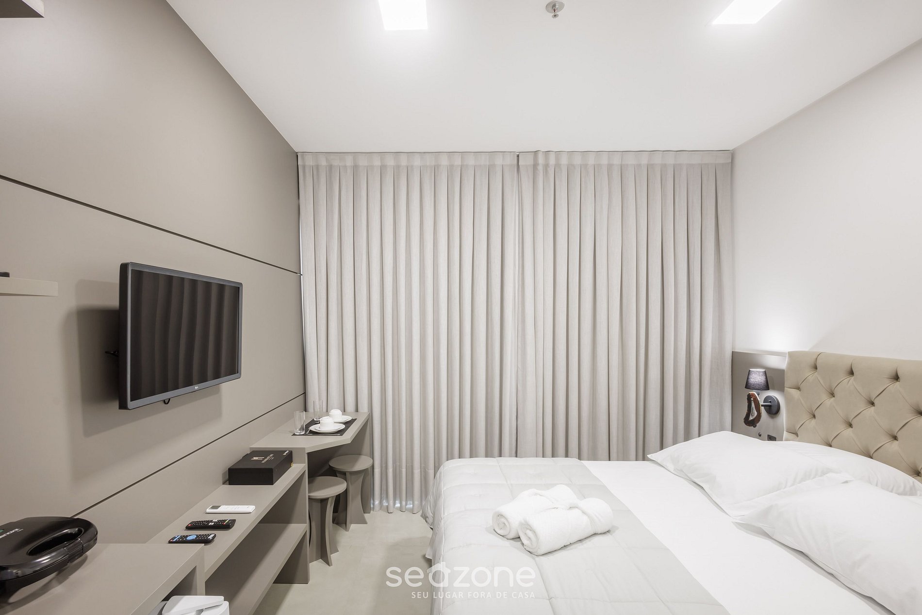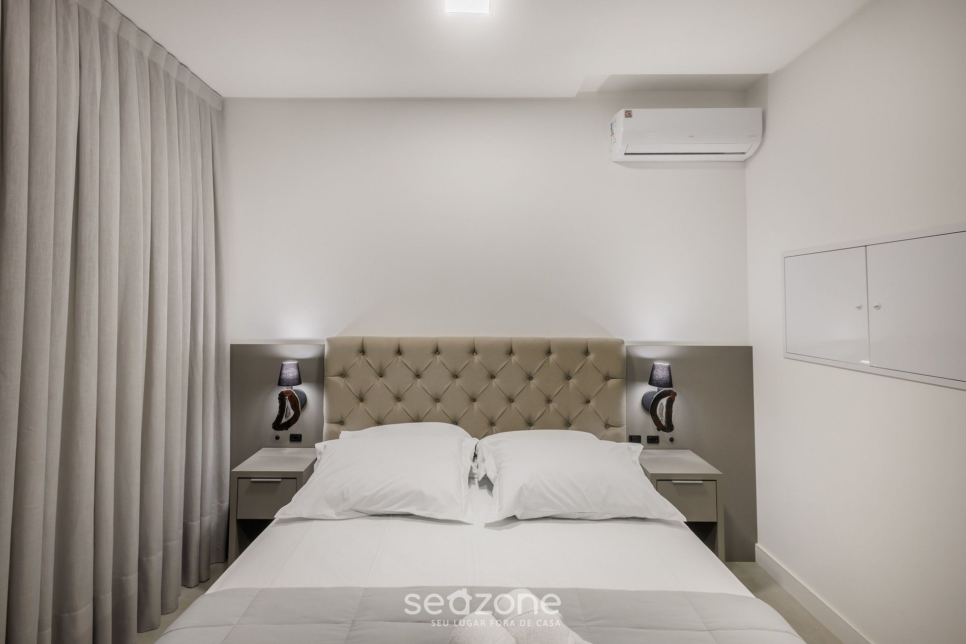 - 1 Cama de casal queen size, cortinas blackout, smart TV e ar-condicionado;