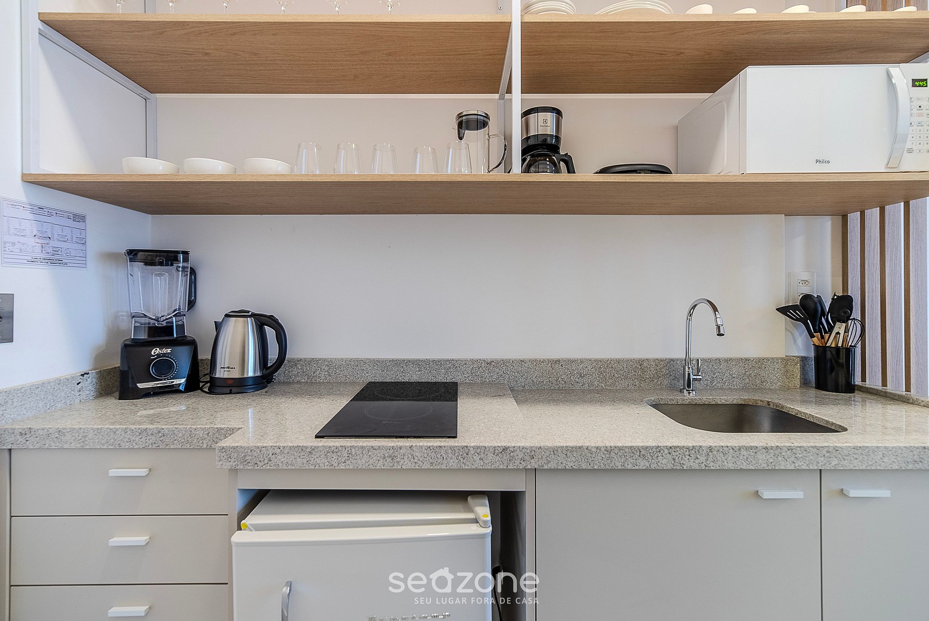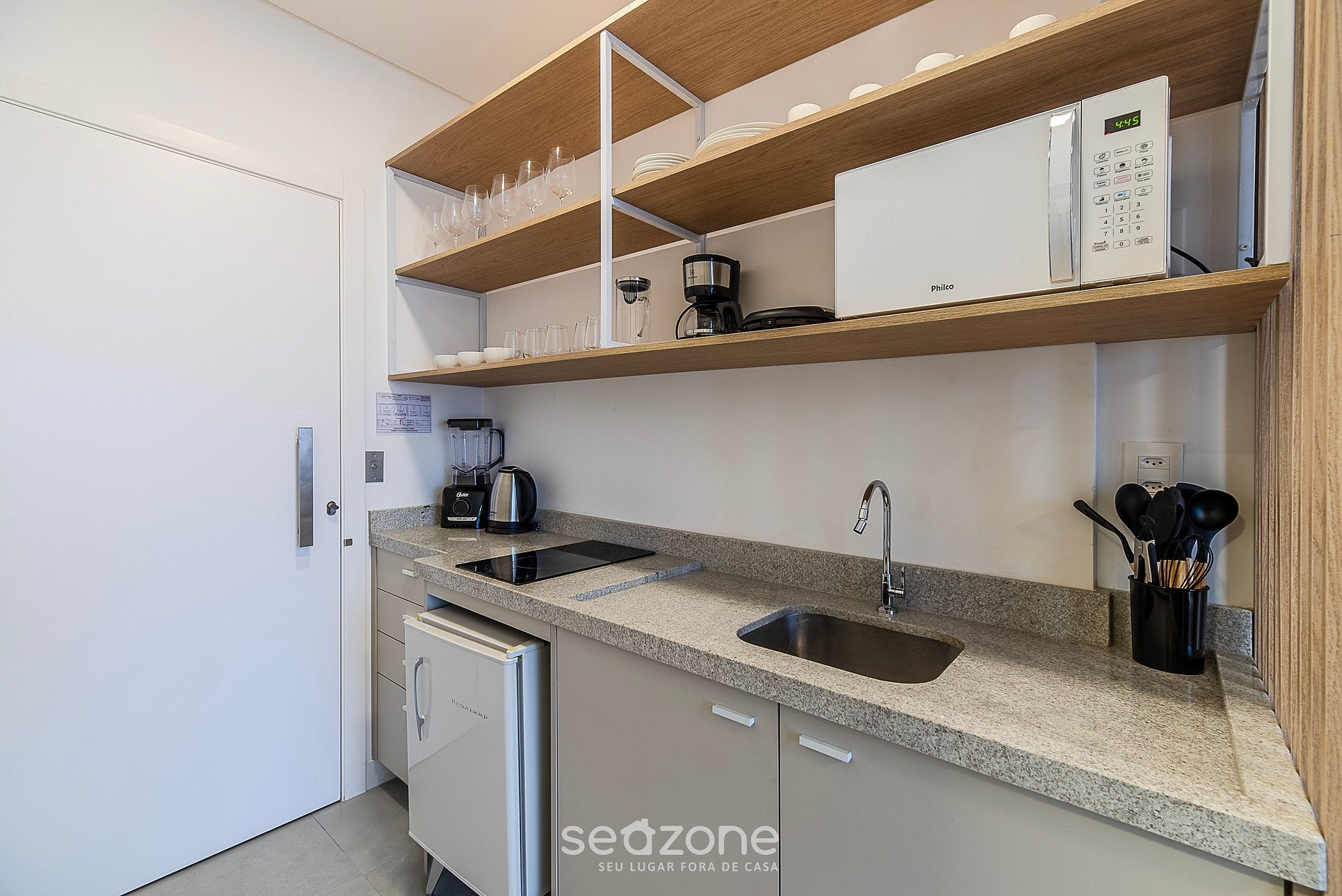 - Frigobar, fogão cooktop, micro-ondas, cafeteira, chaleira elétrica, taças de vinho, louças e utensílios;