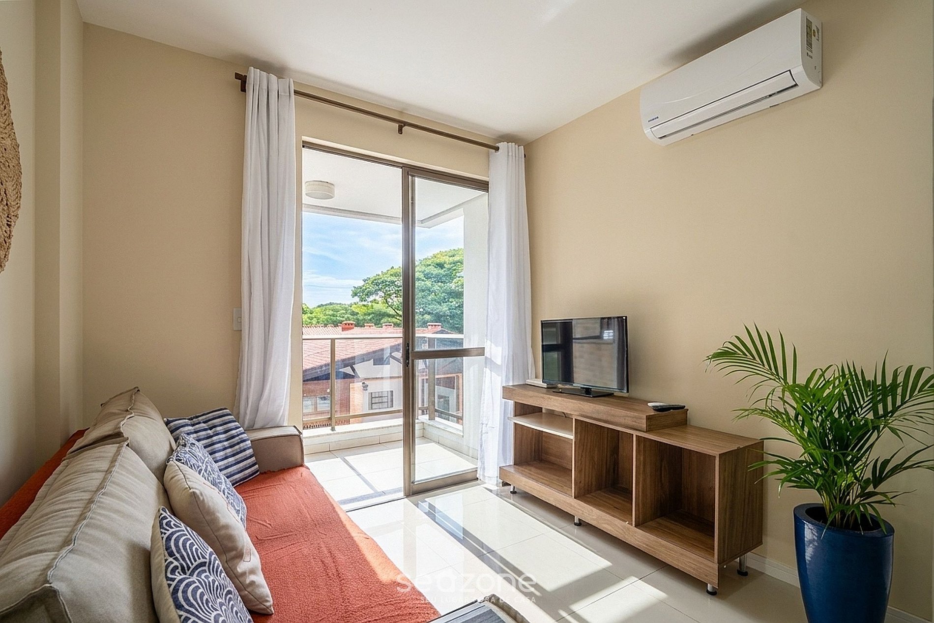 - Sala de estar com sofá, Smart TV e ar condicionado;