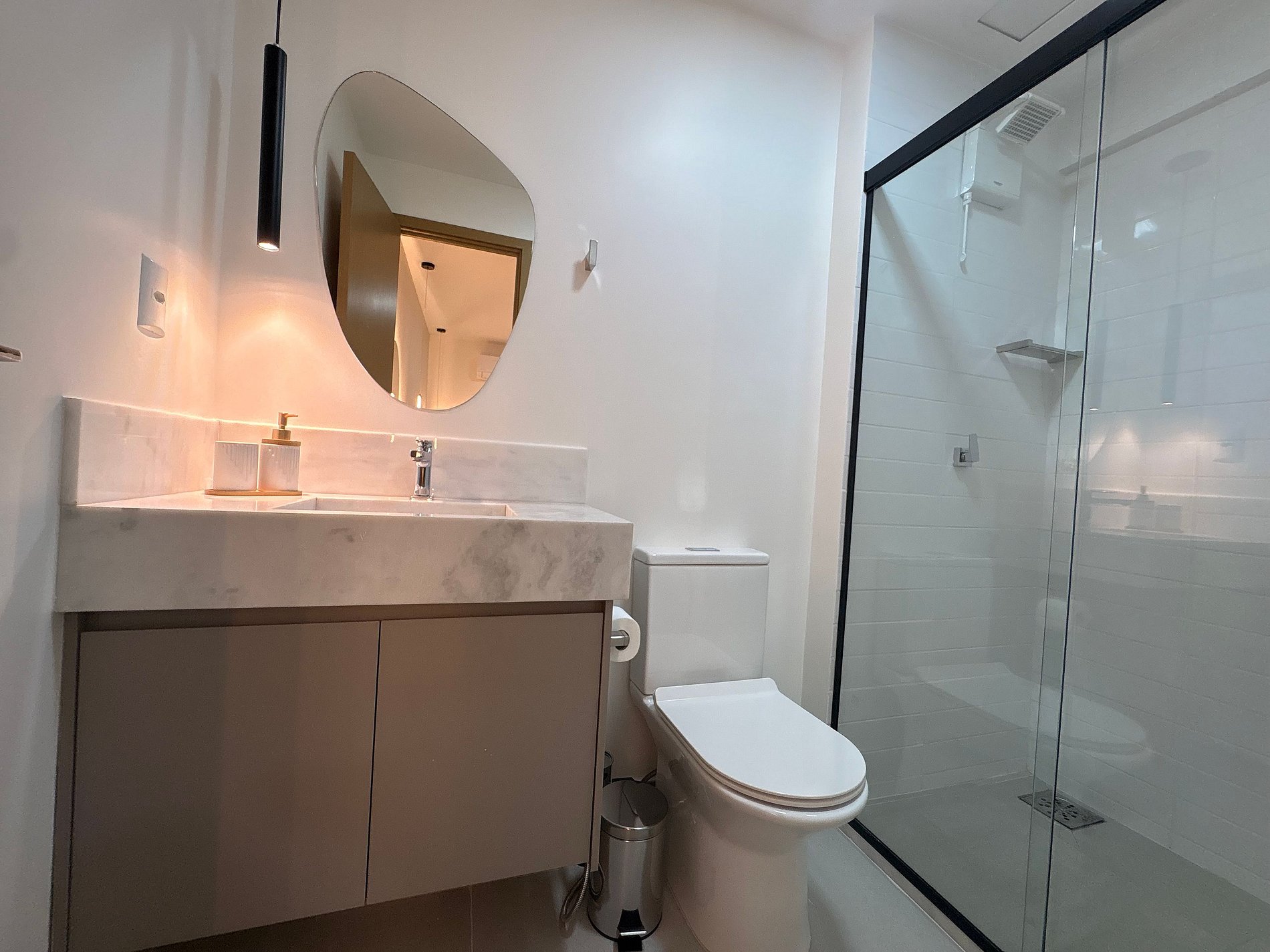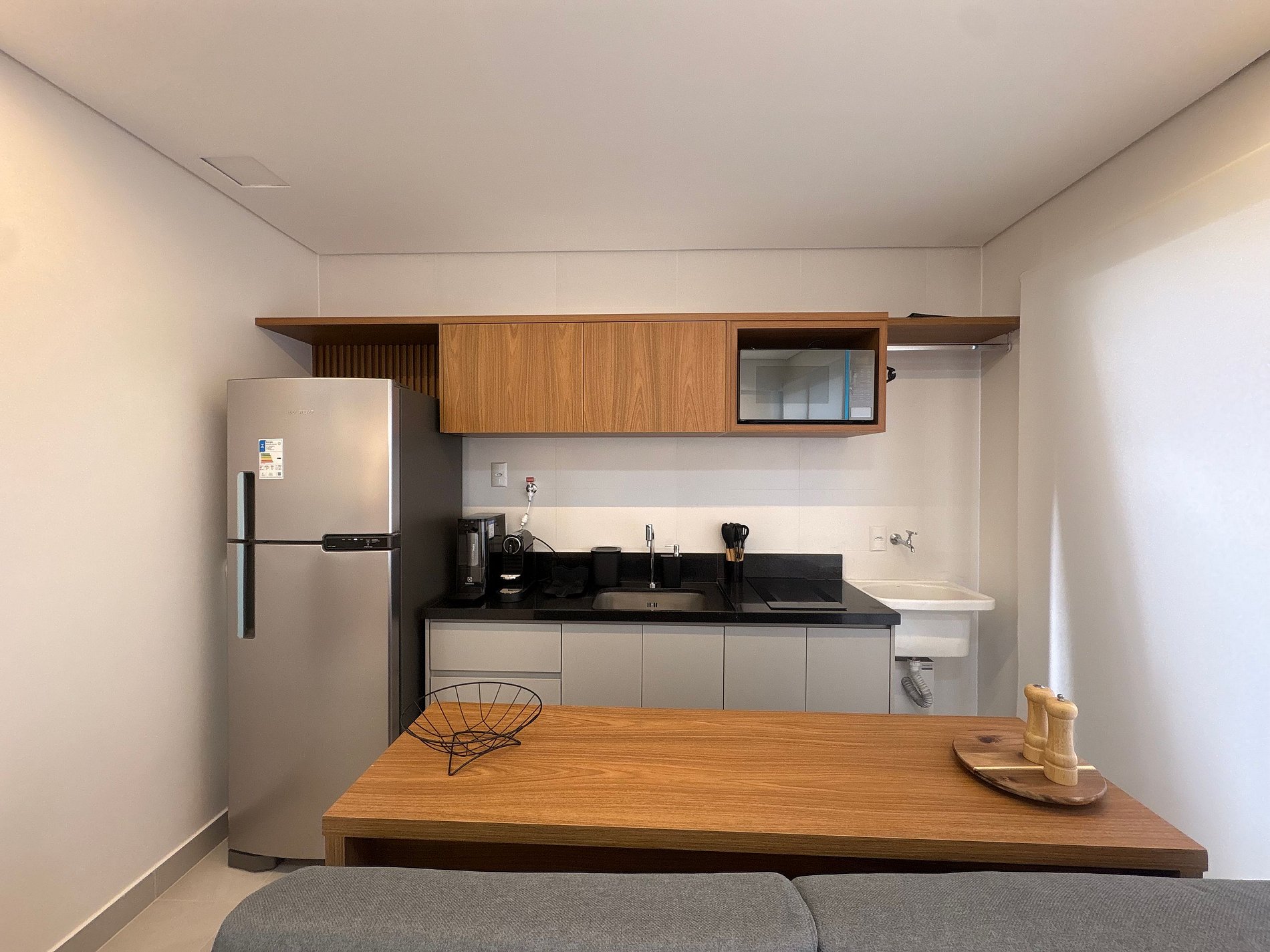 - Cozinha completa com geladeira, cooktop de indução, airfryer, sanduicheira, cafeteira elétrica, chaleira, liquidificador, filtro de água, taças de vinho, panelas, louças e utensílios;