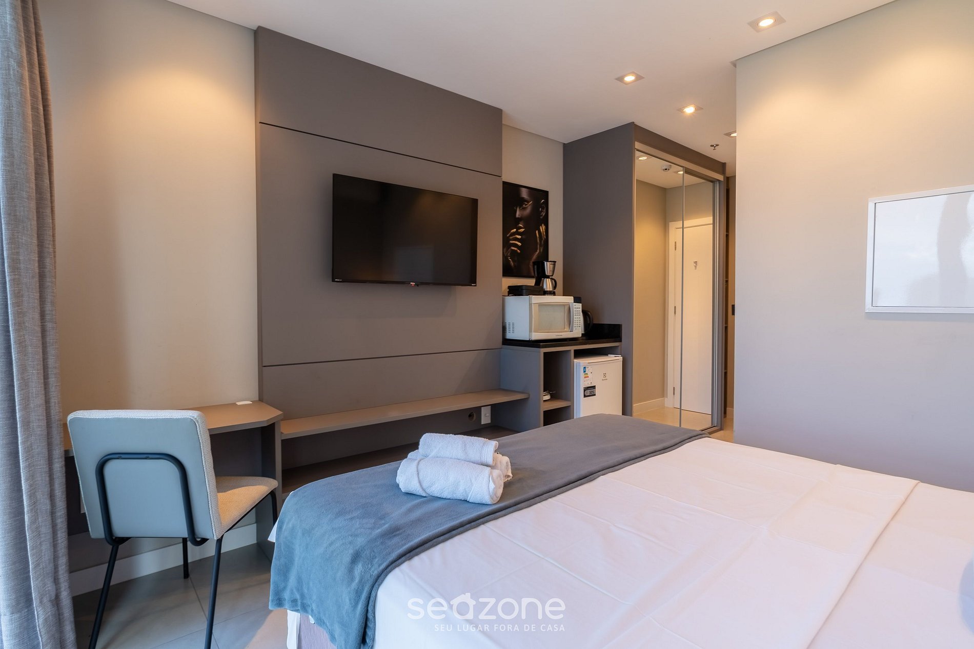 - Estúdio com 1 cama Queen size, armário, Smart TV e ar-condicionado;