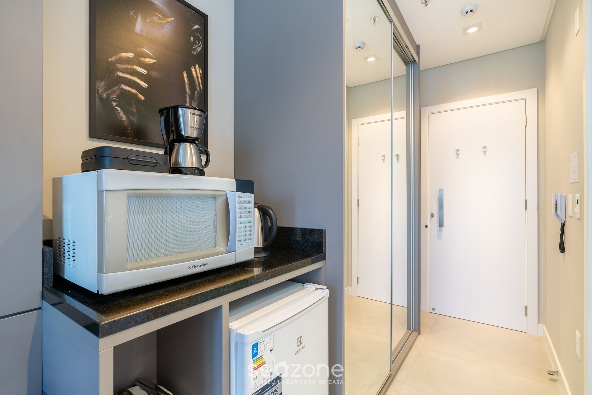 - Cozinha compacta com frigobar, chaleira elétrica, sanduicheira, cafeteira elétrica, abridor de vinho, louças e utensílios;
